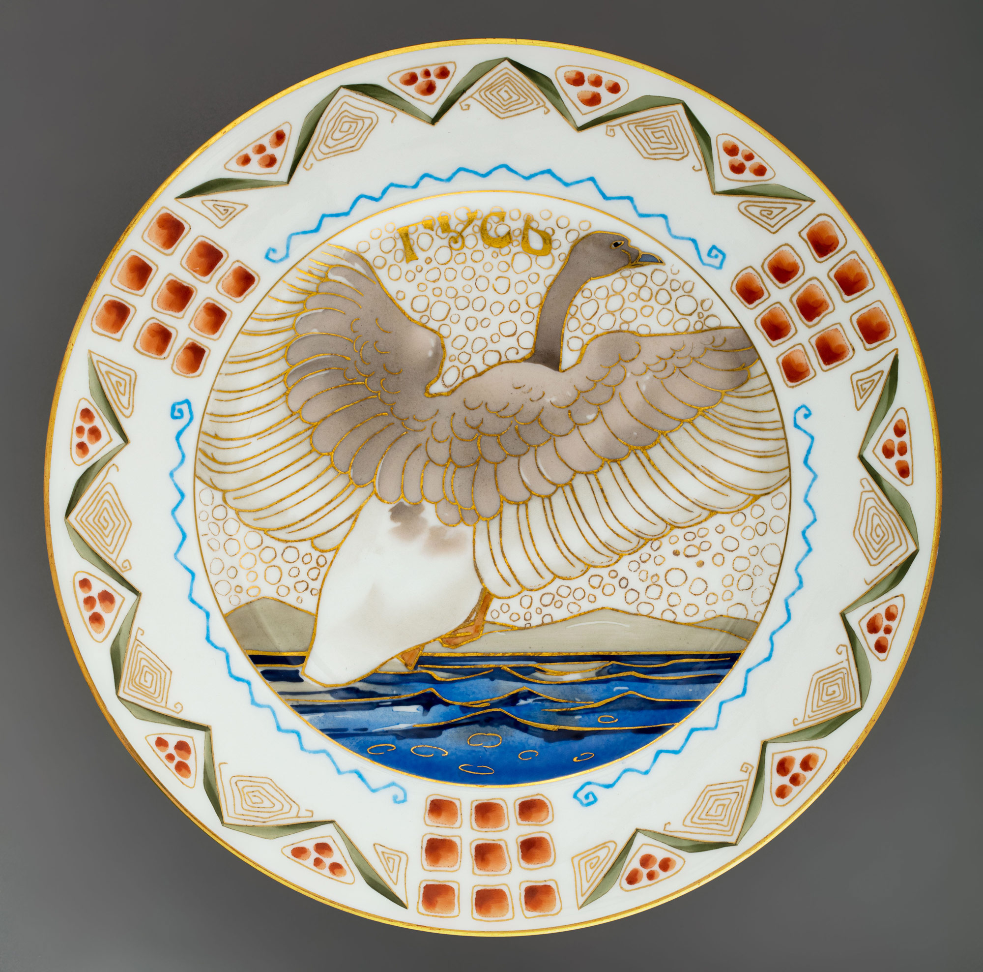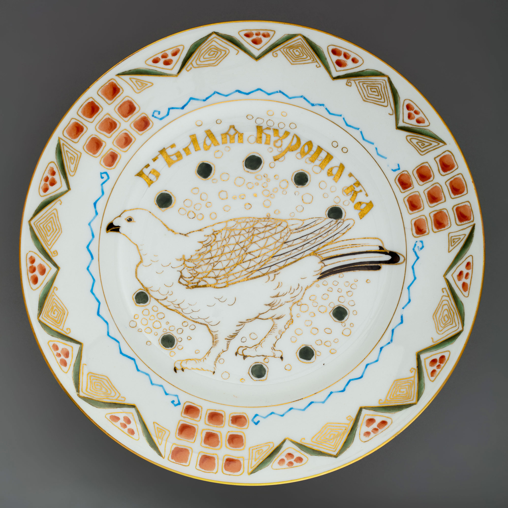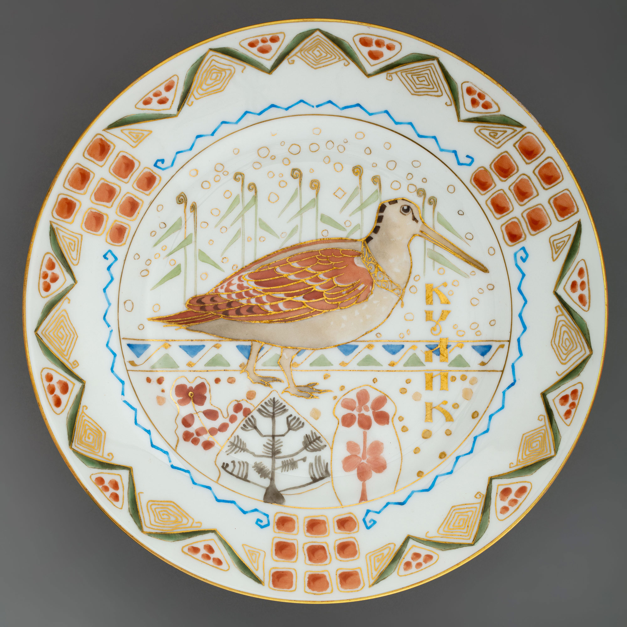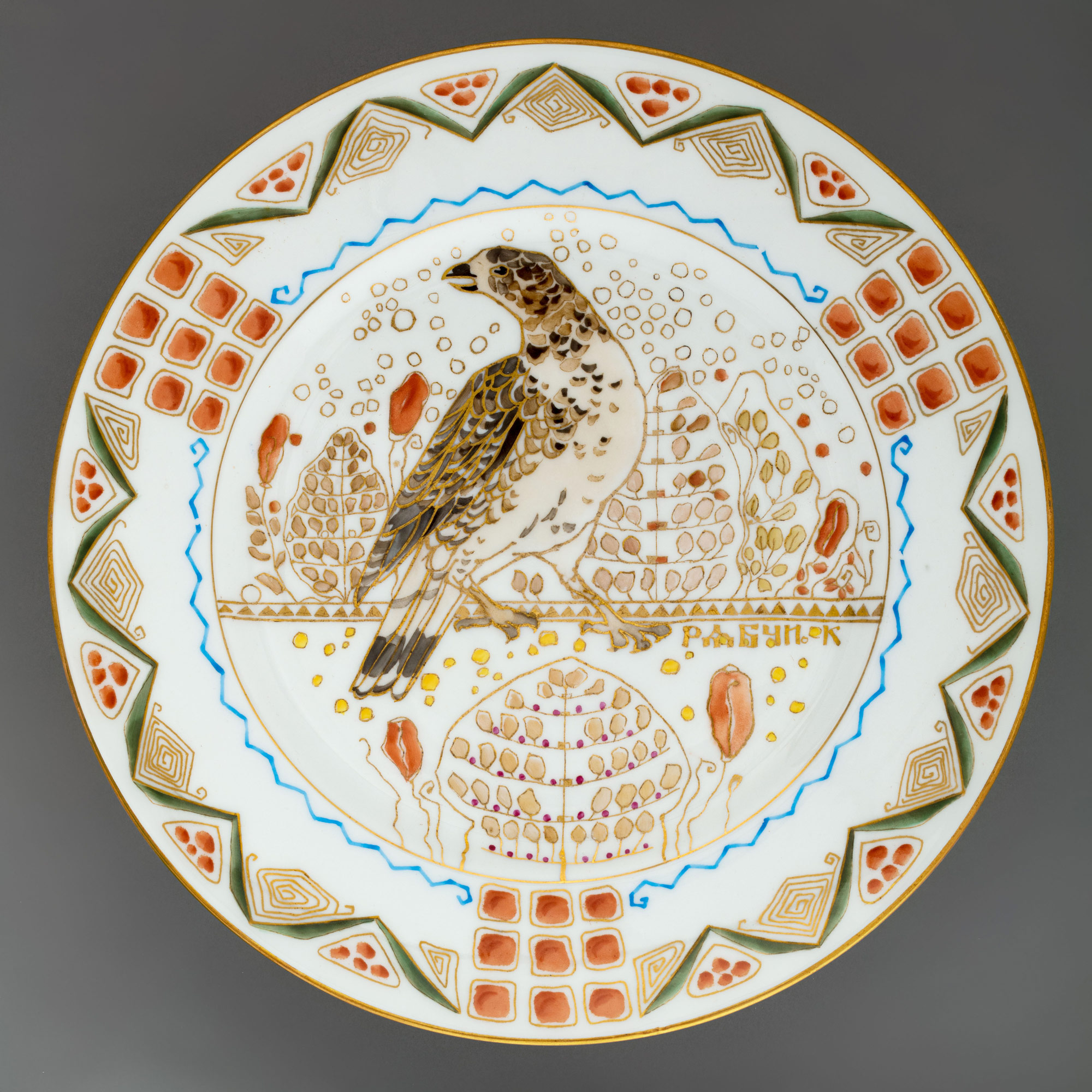 Надписи: на обороте надглазурно от руки красным — Teal duck, Moorcock, Wild goose, Siberian partridge