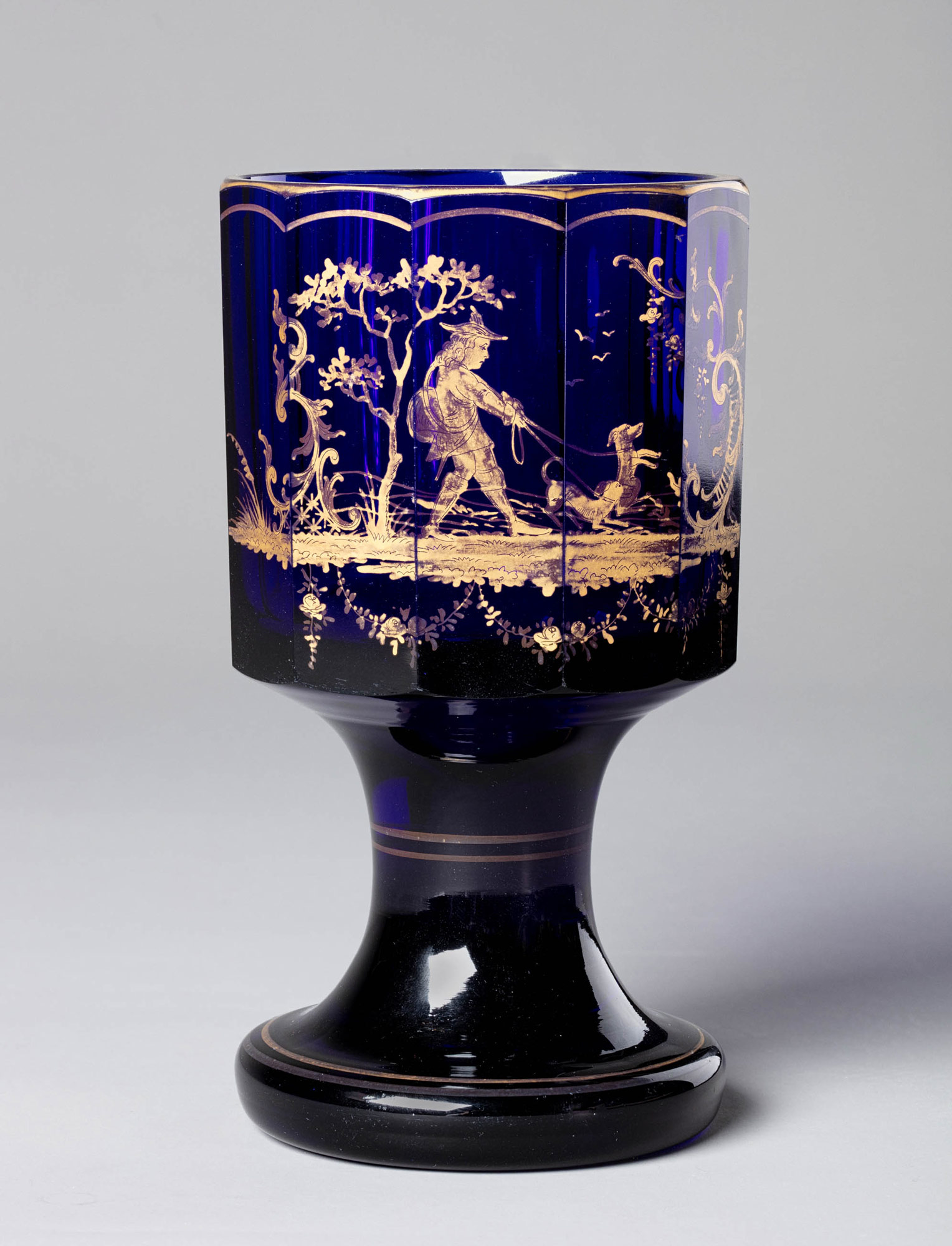 Представленный бокал является прекрасным образцом изделий северо-богемских стеклоделов. Северная Богемия была признанным центром стеклоделия ещё в XVII–XIX вв. и славилась как изготовлением стекла, так и разнообразием его декорирования. Сюда, на многочисленные заводы северных областей, привозилось для окончательной отделки стеклянное необработанное «гладьё» из Восточной и Южной Богемии и других мест этого обширного стекольного региона. Среди широкого разнообразия изделий бытового, декоративного и сувенирного характера, а также методов их декорирования были распространены росписи золотом. Среди них выделялись веками традиционные для этого региона разнообразные охотничьи сюжеты, исполнявшиеся по мотивам графических произведений. Подобные предметы по желанию заказчика могли повторяться. При этом росписи золотом, отличавшиеся изяществом, по манере и характеру композиций близко соотносились с охотничьими сюжетами на гравированных кубках соседней Силезии, где мастера также славились высоким уровнем исполнения сложных гравированных композиций.