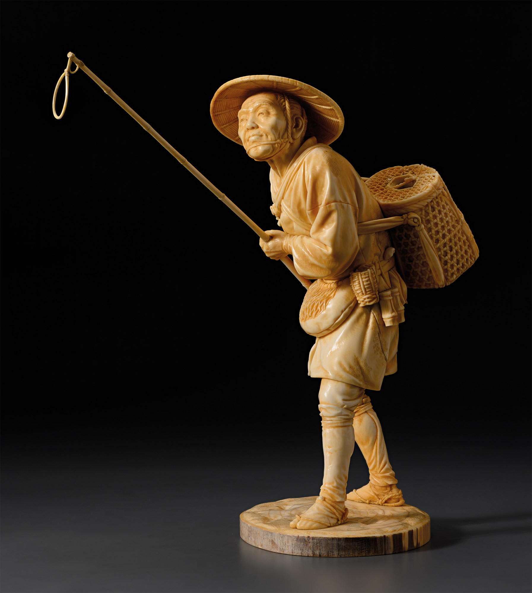 Произведение известного мастера Удагавы Кадзуо. Окимоно изображает пожилого мужчину, держащего в руках палку-силок с петлей для ловли птиц. За спиной птицелова изображена плетеная соломенная корзина с крышкой, крестообразно привязанная к груди тканой веревкой. Голову мужчины прикрывает конусообразная соломенная шляпа. На его поясе виднеется пустая сетка для птиц. Птицелов внимательно осматривает петлю силка.