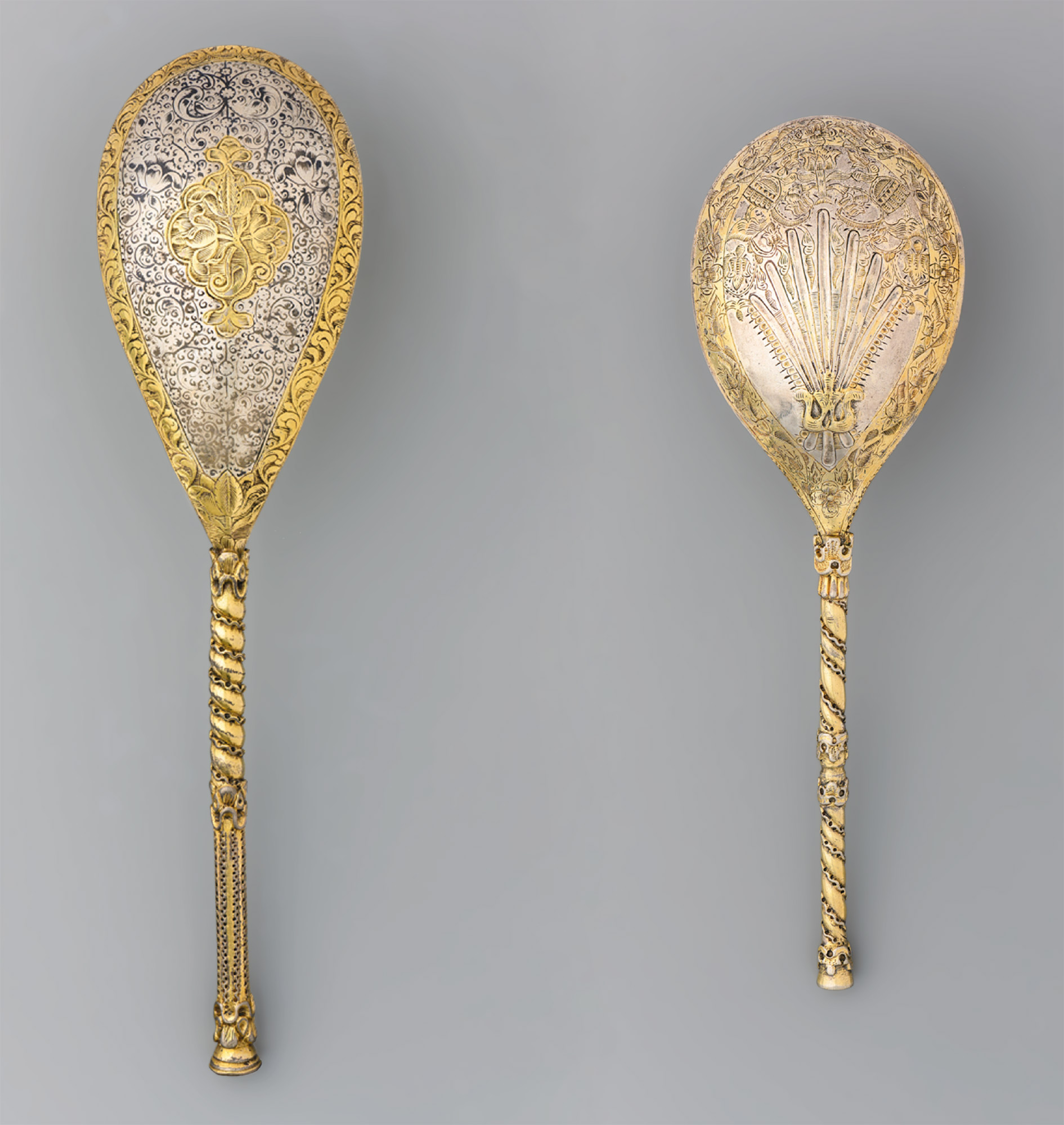 Одна из ложек — с длинным комбинированным черенком, витым и линейным точечным декором и более вытянутым овальным черпачком, украшенным с внешней стороны плотным, тонким графическим орнаментом из лиственных завитков и цветов в технике черни по серебру без позолоты. В центре — позолоченный медальон с чеканно-резным цветочным декором. По периметру черпачка — позолоченный фриз из непрерывно вьющихся растительных побегов стилизованного аканта. Оборотная сторона черпачка — позолоченная и украшенная на шейке резным изображением цветка. В более точной датировке ложку можно отнести к группе посудных изделий конца XVII в.