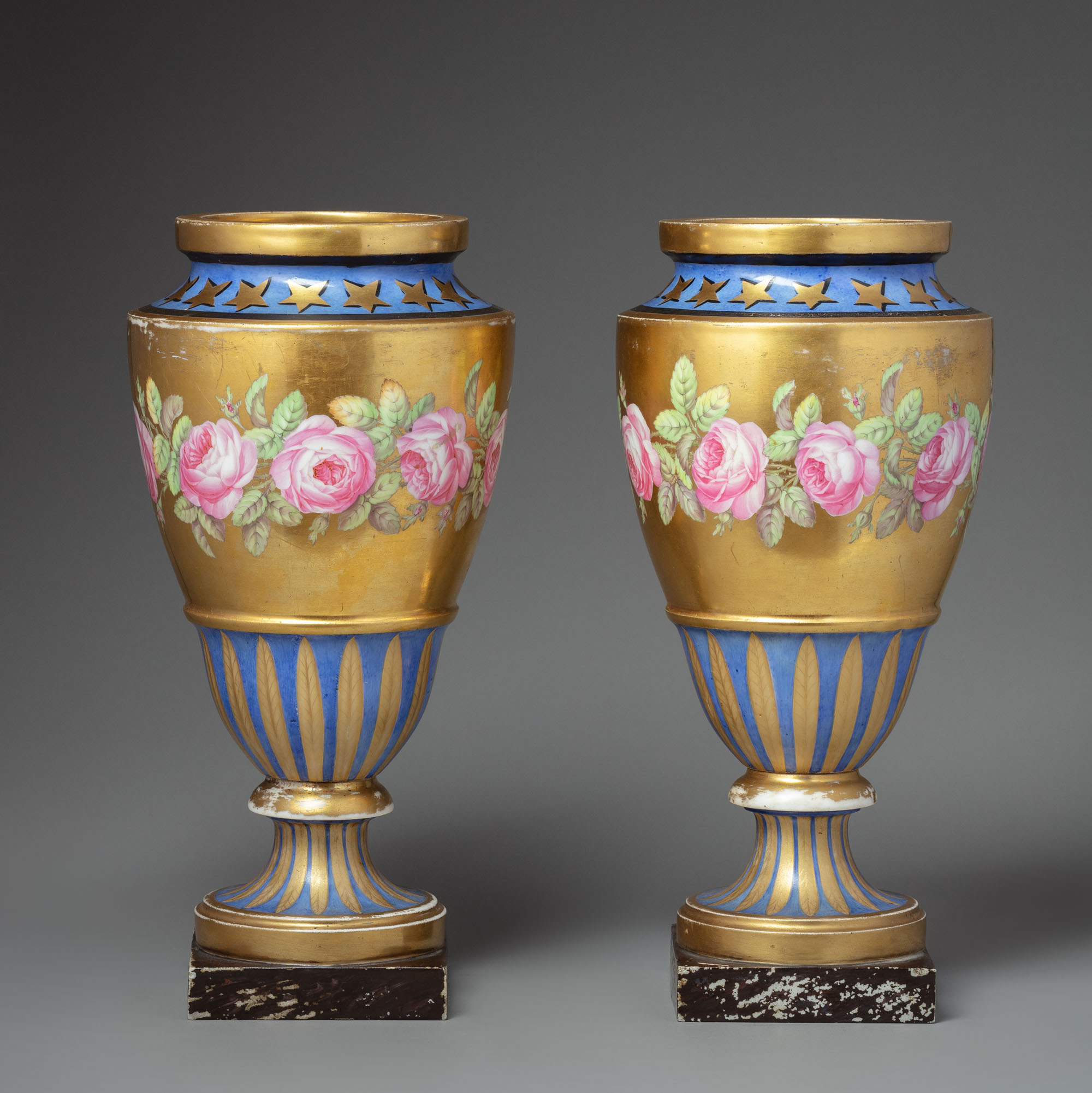 Архитектонике лаконичных по силуэту ваз подчиняется живописный орнамент, в виде сплетений цветов роз на тулове. Пурпурные и травянисто-зелёные оттенки цветовой гаммы росписи полностью сопоставляются с красочной палитрой Императорского фарфорового завода. В процессе сравнительного искусствоведческого анализа интересующей нас пары ваз с сигнальными образцами из собраний Государственного Эрмитажа и Государственного музея-заповедника «Павловск», стало очевидно единство художественного решения живописных фризов с флоральной росписью в виде роз.