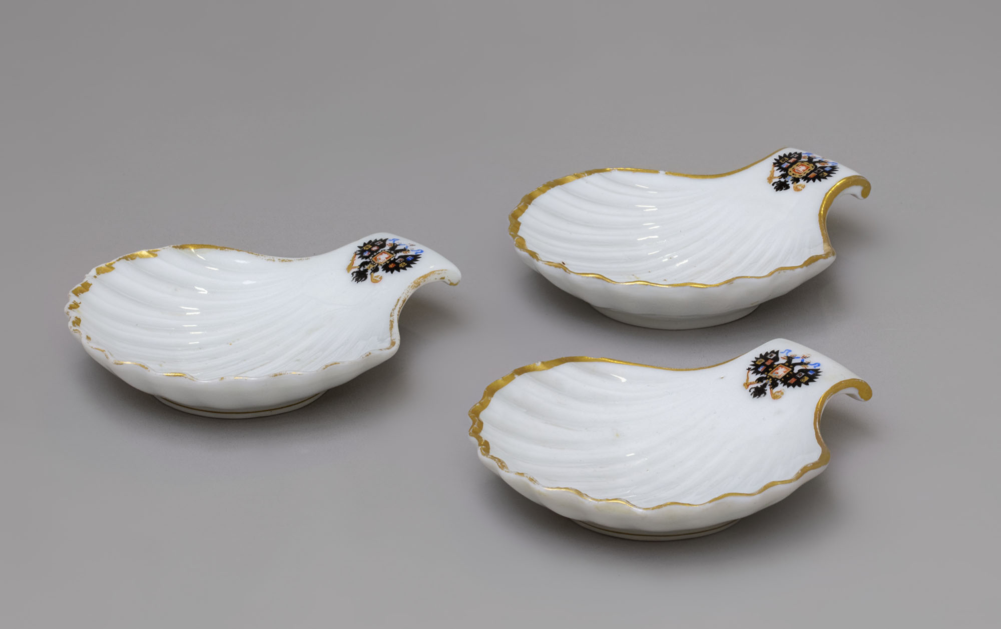Икорницы — лотки для рыбной икры — на Императорском фарфоровом заводе чаще всего выполнялись в форме раковины морского гребешка и универсально дополняли парадные сервизы разных форм и декоров. Вероятно, для выполнения срочного заказа на комплектацию «Коронационного сервиза» 1883 года использовались в том числе «раковины» из кладовых готового фарфорового «белья», маркированные подглазурно монограммой императора Александра II.