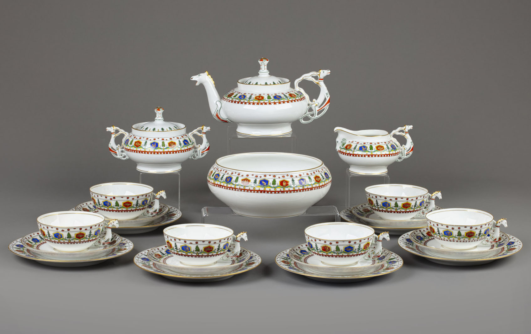 Билибин Иван Яковлевич (1876–1942) — русский художник, книжный иллюстратор и театральный оформитель, участник объединения «Мир искусства». Славу Билибину принесли яркие, неповторимые по выразительности иллюстрации к сказочным сюжетам, вошедшие в серию книг Экспедиции заготовления государственных бумаг. Орнаментальный декор экспортной посудной серии в неорусском стиле завода братьев Корниловых цитирует книжное оформление к сказке «Пёрышко Финиста Ясна-Сокола» 1900 года.