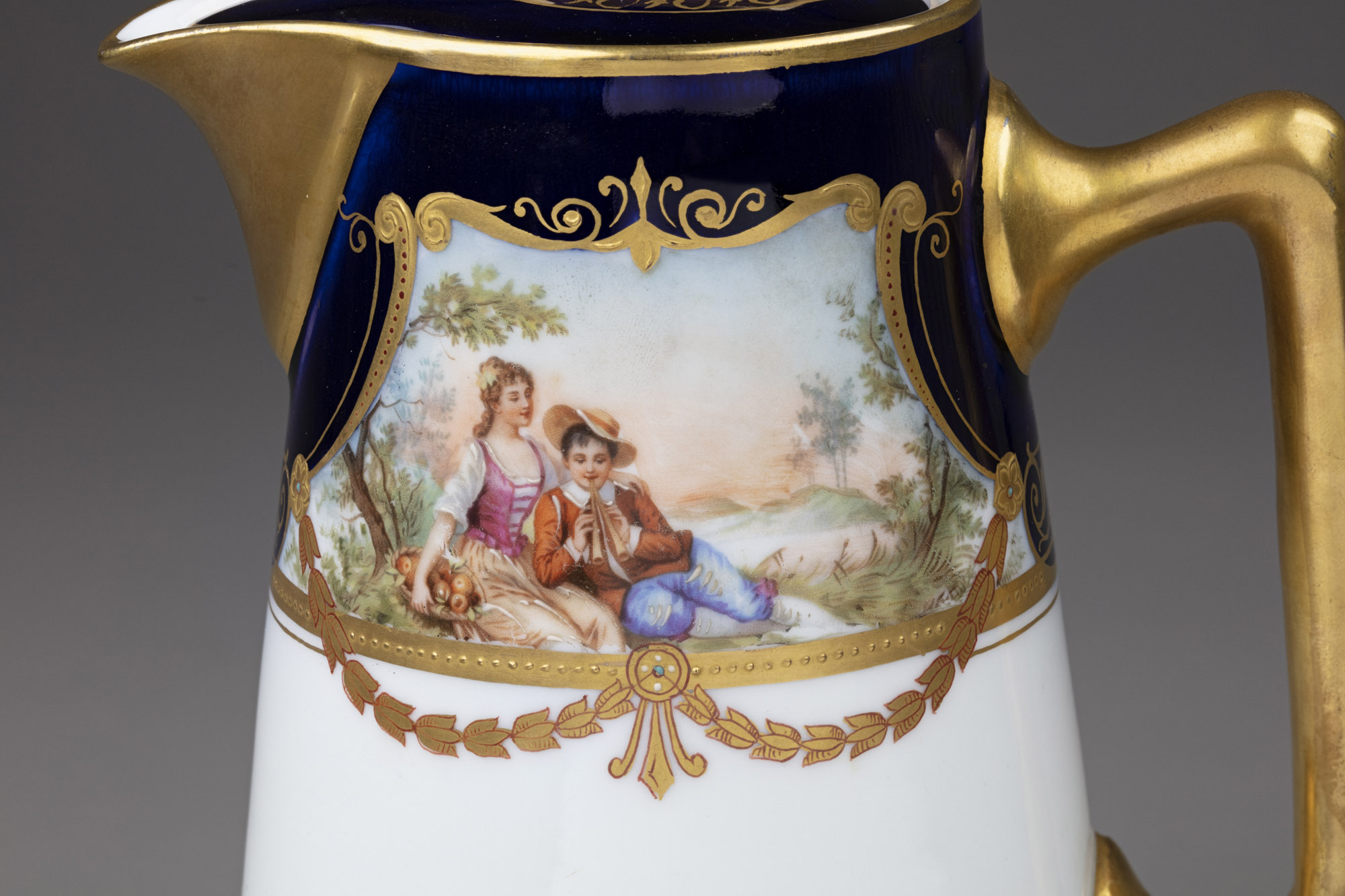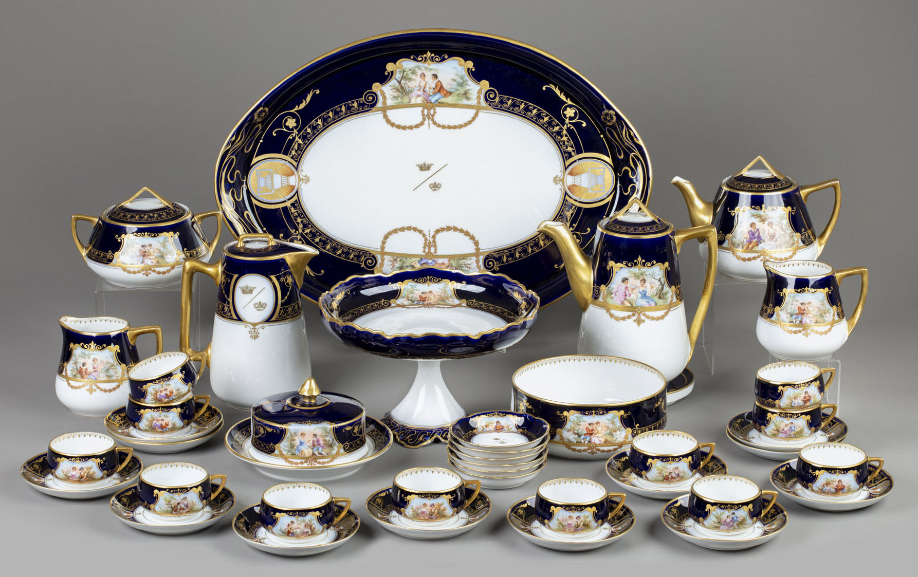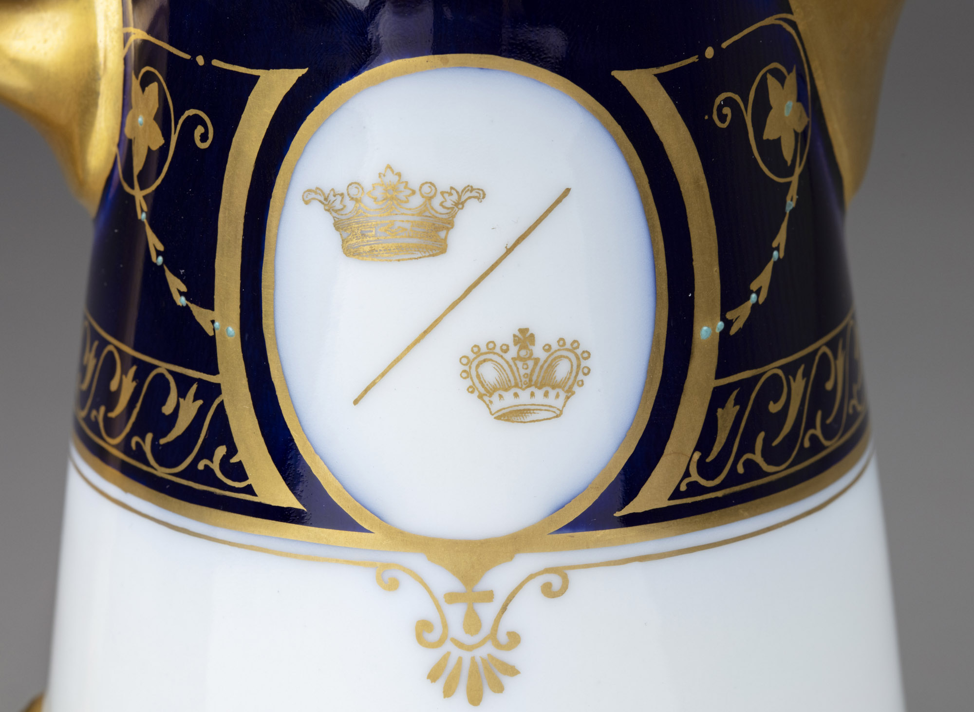 На аукцион представлен чайно-кофейный сервиз, расширенной комплектации и декорированный под заказ к свадьбе. Идеальная сохранность предметов и декора явно говорит, что сервиз берегли как семейную реликвию. В декоре всех предметов изображён медальон с двумя «коронами достоинства» — Дворянской и Княжеской — как вариант традиции марьяжного герба. Марьяж — от французского слова mariage, от mari — супруг, муж, замужество, брак.