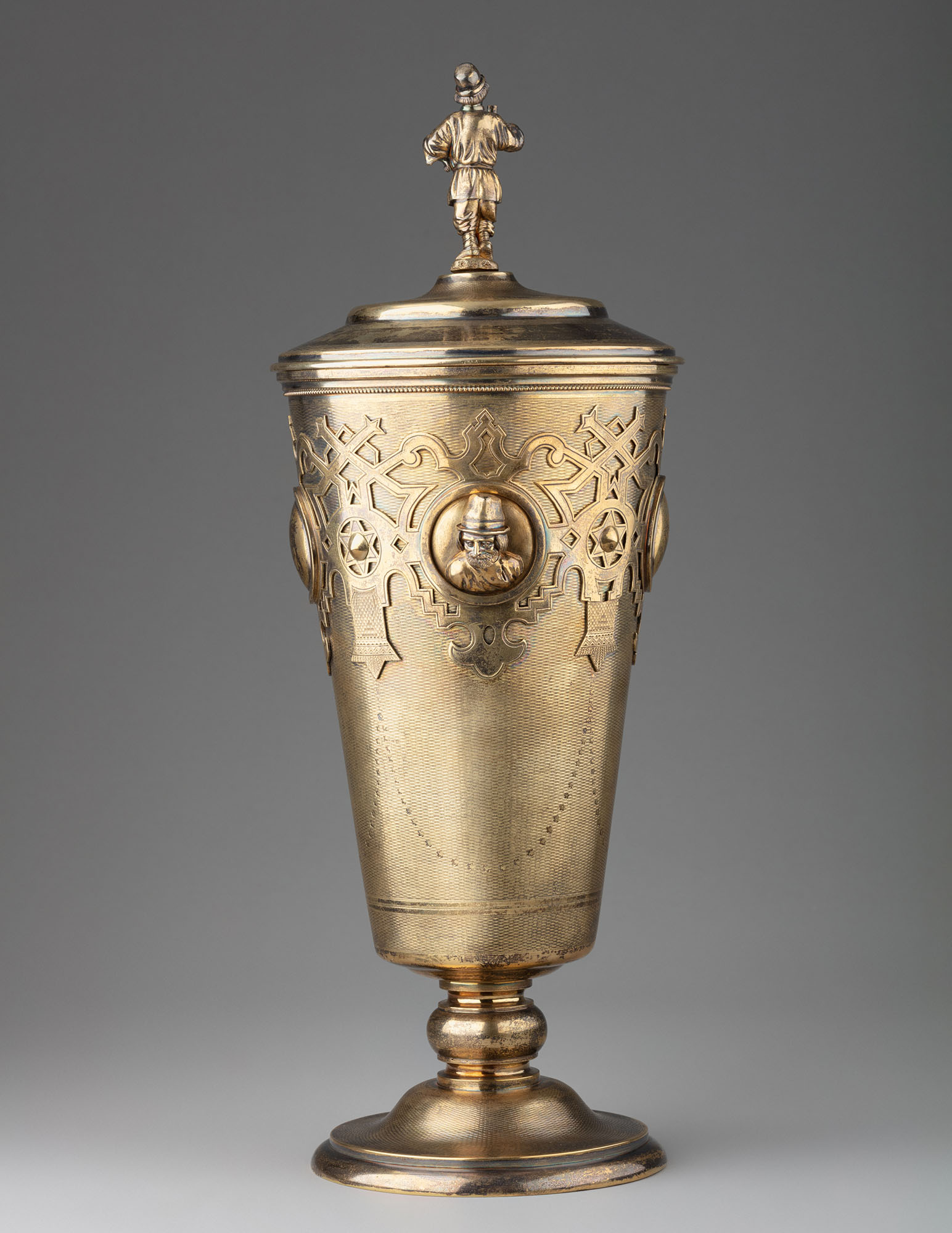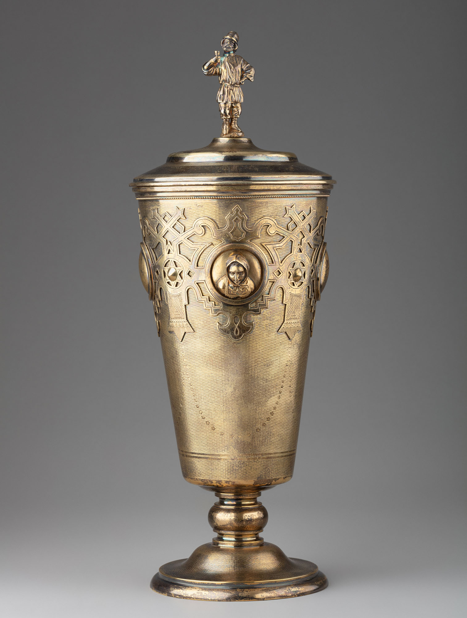 Кубок в виде высокой стопы конической формы, расширяющейся кверху, на ножке, со ступенчатым основанием и слегка выпуклой съёмной крышкой. Верхняя часть корпуса украшена накладным орнаментом в русском стиле, в который вплетены четыре круглых медальона. В двух медальонах — мужская и женская головки, исполненные в высоком рельефе. Крышку венчает литая фигура стоящего крестьянина, держащего в правой руке стакан.