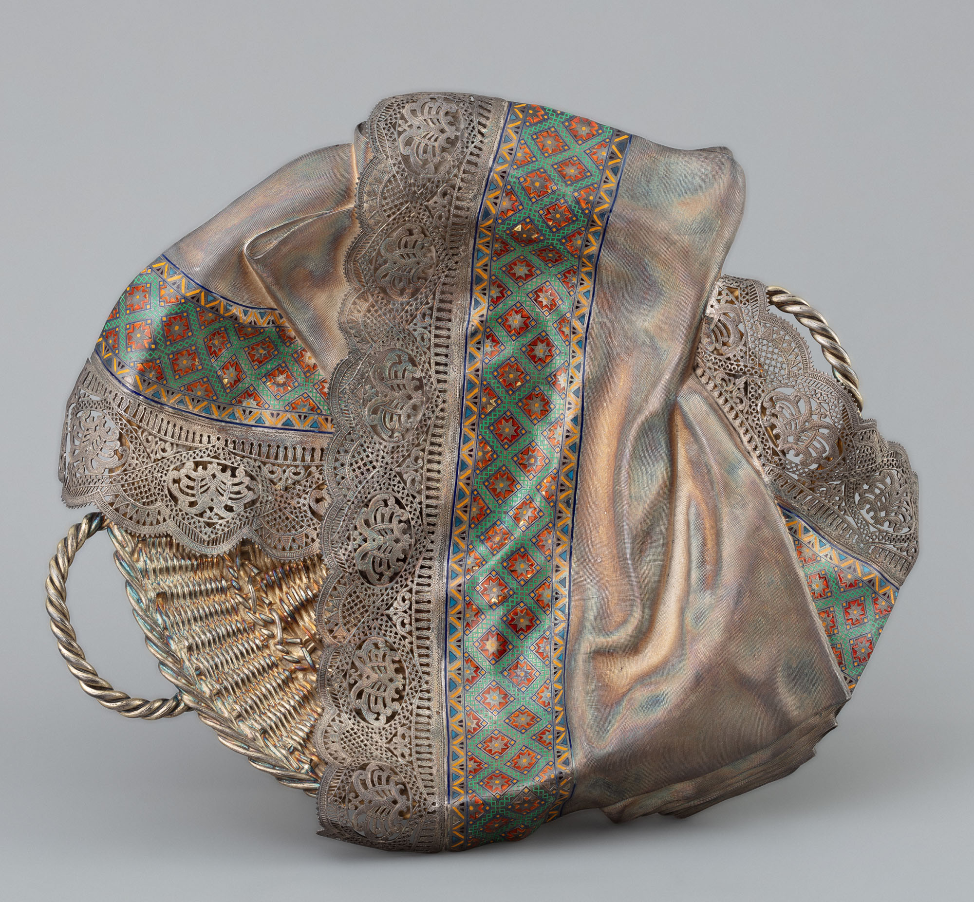 Сухарница серебряная овальная, в форме неглубокой плетёной корзины с двумя ручками, на которую небрежно положено чеканное полотенце с резьбой и эмалью, виртуозно воспроизводящими фактуру льняной ткани с кружевным краем и пёстрой вышивкой.