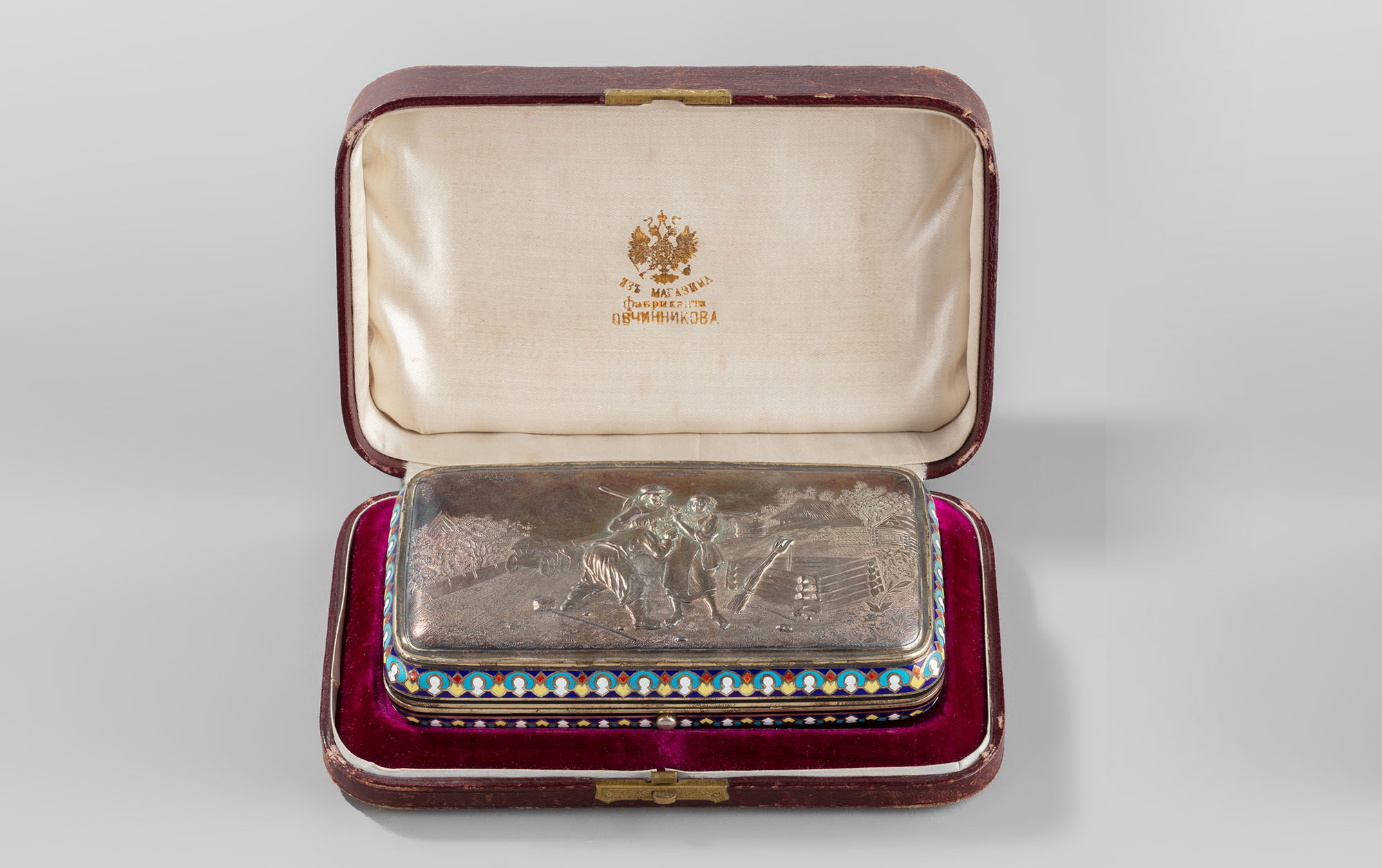 Предмет помещён в оригинальный футляр с тиснёной золотом надписью: «Изъ магазина // Фабриканта // ОВЧИННИКОВА».