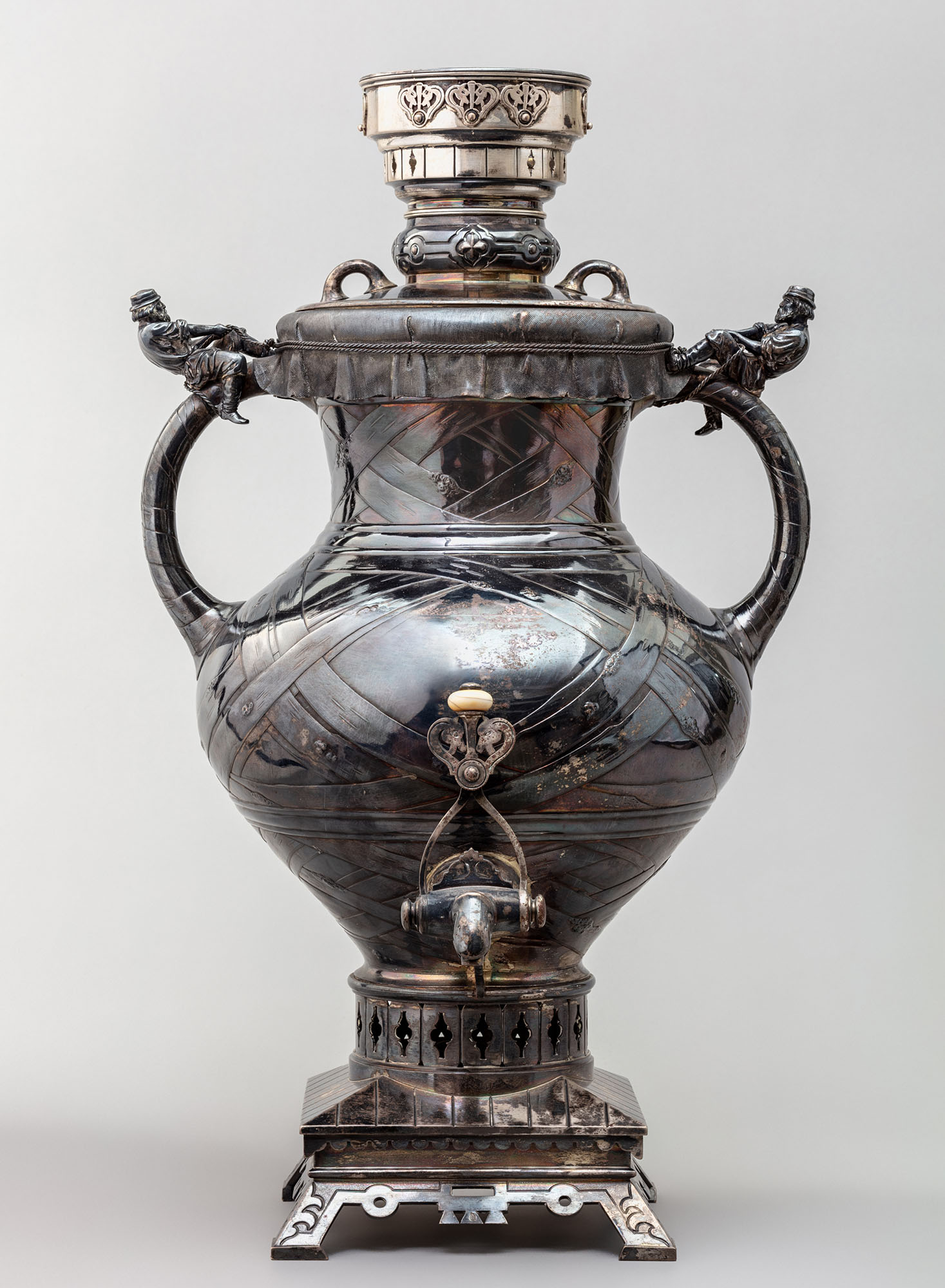 Самовар исполнен в русском стиле, господствовавшем в отечественном искусстве последней трети XIX века. Его корпус имитирует глиняную крынку с двумя ручками по бокам, полностью обёрнутую берестой. Отверстие крынки как бы накрыто плотной холщовой тканью, затянутой вокруг горлышка тонкой бечёвкой. На ручках самовара помещены две литые фигуры русских мужиков в крестьянской одежде, которые с силой натягивают концы верёвки. Квадратное основание выполнено с использованием мотивов русского деревянного зодчества. Кран оформлен в форме двух обращённых друг к другу лошадиных голов. Оригинальное навершие воссоздано в 2015 году во время реставрации, с творческим осмыслением сохранных декоративных элементов самовара.