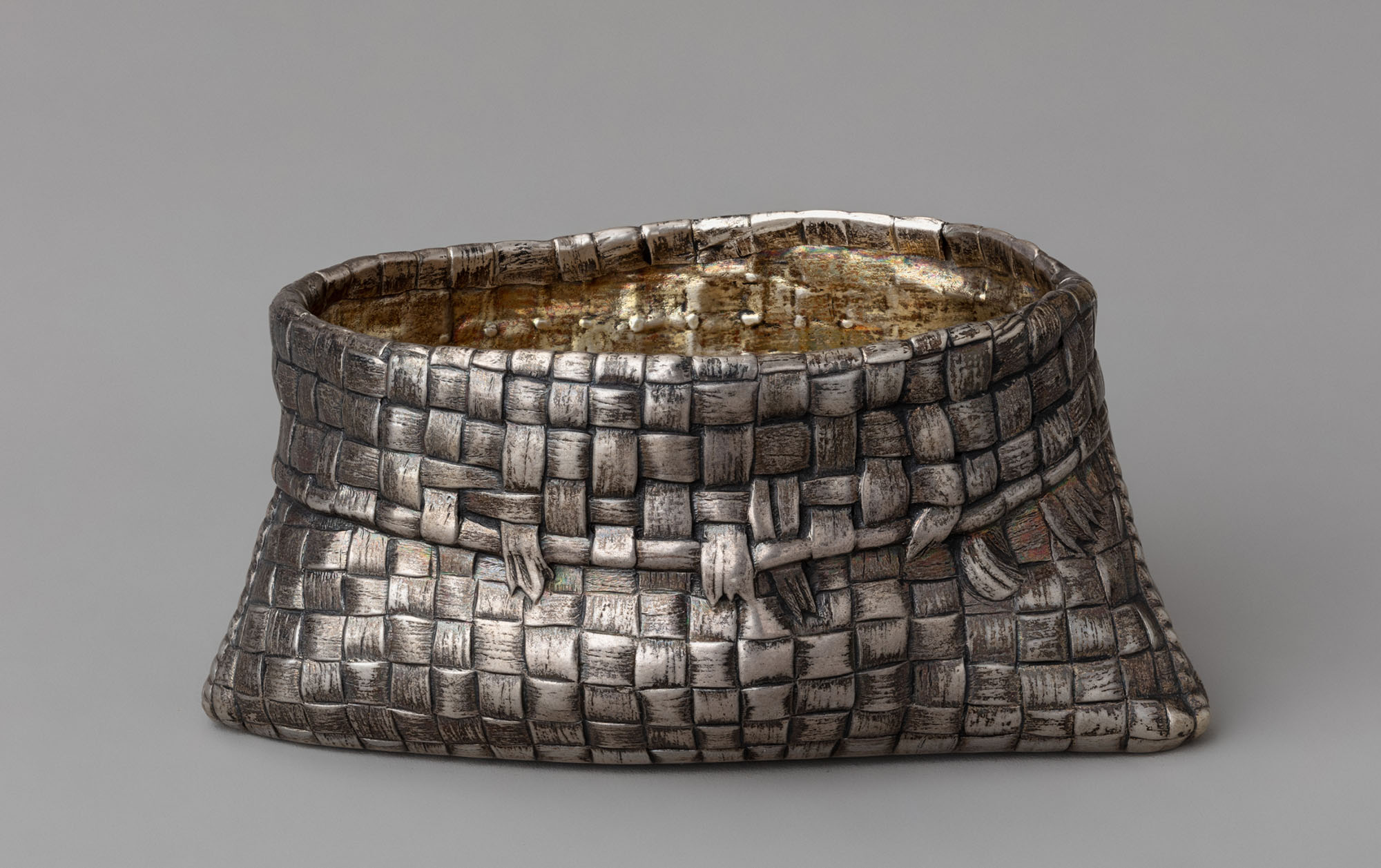 Солонка исполнена в виде небольшого плетёного из лыка мешочка, густо вызолоченного внутри. Необычная обработка поверхности предмета прекрасно имитирует народную бытовую вещь.