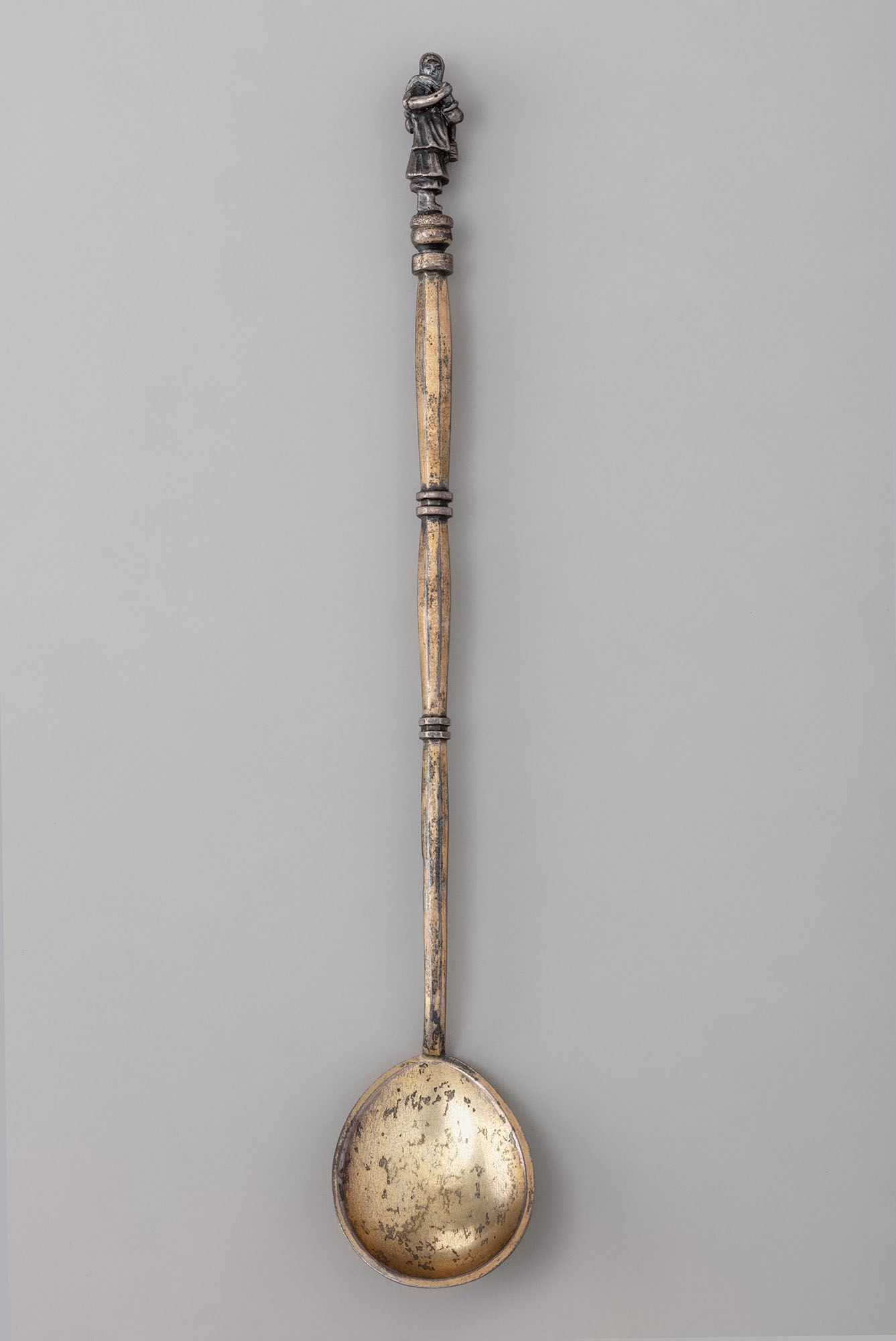 Серебряная позолоченная ложка с округлым, слегка заострённым у основания черпачком и длинным гранёным, с двумя кольцевыми перехватами, черенком, заканчивающимся литым скульптурным изображением идущей по воду крестьянки. Этот сюжет нередко воспроизводился в произведениях декоративного искусства; достаточно вспомнить знаменитую «Водоноску» С. С. Пименова. Но в данном случае, мастер отошёл от классического типажа, поместив ведро не на коромысло, а в руку героини.