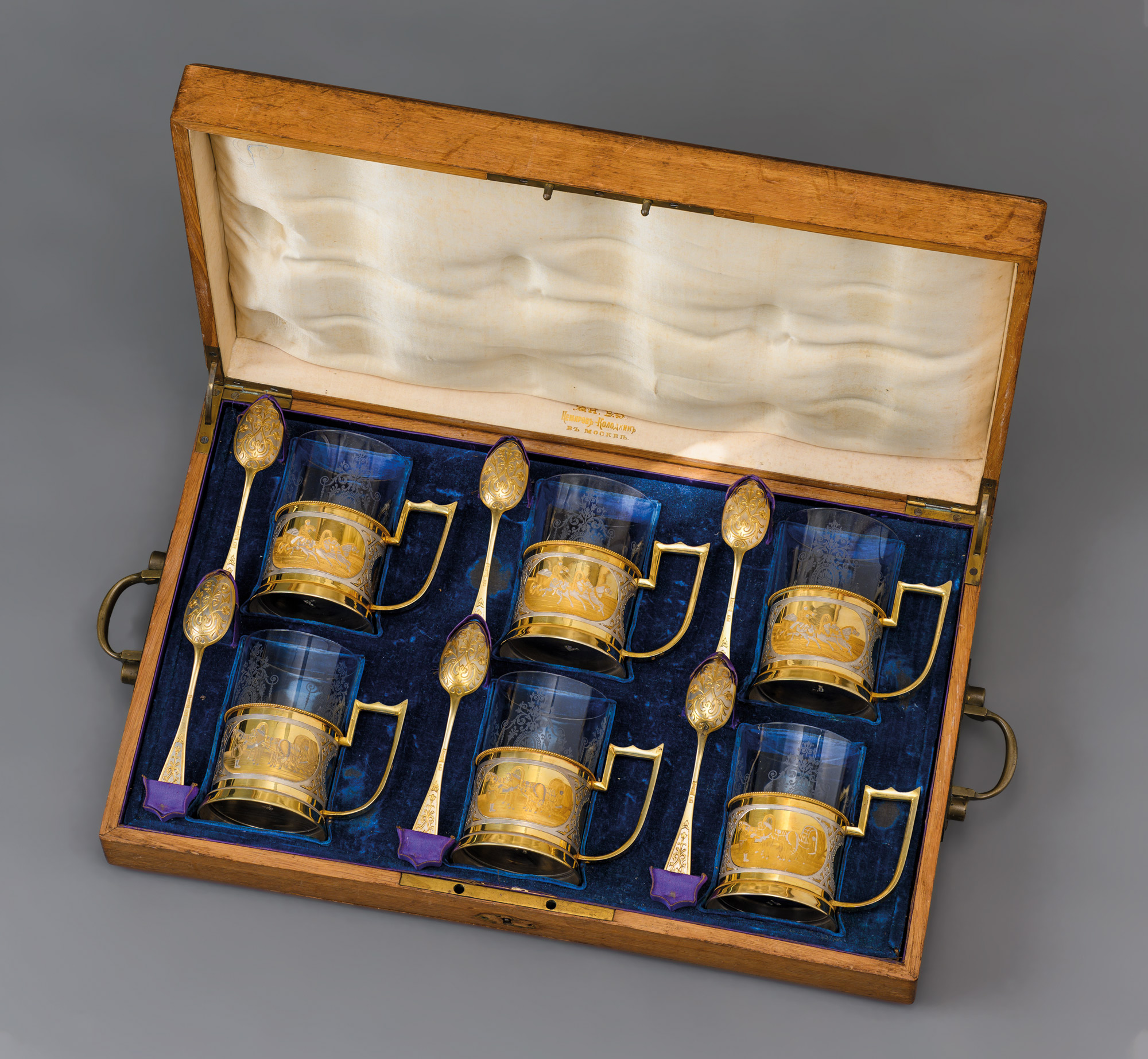 В набор для русского чаепития входят шесть серебряных подстаканников с позолотой, жанровой гравировкой и фигурной ручкой, и шесть чайных ложек. В каждый подстаканник вставлен тонкий стеклянный стакан с матовым растительным рисунком в технике травления. Все предметы уложены в деревянную коробку в специальные ячейки ложемента из синего бархата (донная часть). Коробка с открывающейся на петлях верхней крышкой имеет внутренний латунный замочек (ключ утрачен) и две латунные ручки.