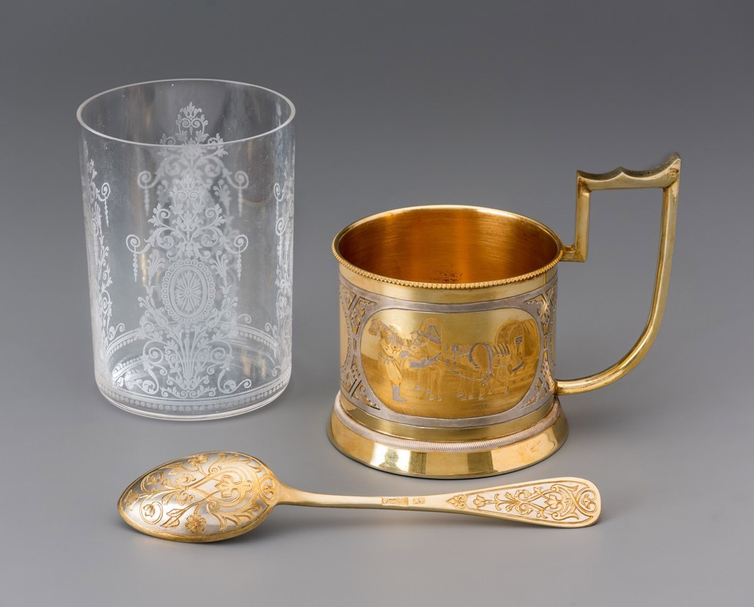 Художественной особенностью этого набора для чаепития является жанровая гравировка на цилиндрических туловах подстаканников и растительно-цветочная резьба на чайных ложках, ярко демонстрирующие один из основных сюжетов русского стиля и широко распространённый орнаментальный мотив в декоративно-прикладном искусстве России втор. пол. XIX в. В овальных картушах на корпусе подстаканников представлены сценки с изображением знаменитой русской тройки, национального символа России, «птицы-тройки», воспетой Н. В. Гоголем в «Мертвых душах». Для жанрового разнообразия русская тройка показана в разных бытовых ситуациях. На одной — молодой ямщик беззаботно мчится на тройке с поклажей в телеге с высокими бортами. Другая, композиционно более сложная сценка, показывает вынужденную остановку тарантаса с путниками, когда кучер вышел к лошадям, чтобы подтянуть супонь (кожаный ремень, которым стягивают клещи хомута) в упряжи коренника (центральная лошадь под дугой). На всех подстаканниках спереди оставлен крупный круглый резерв для нанесения монограммы или любой другой владельческой подписи.