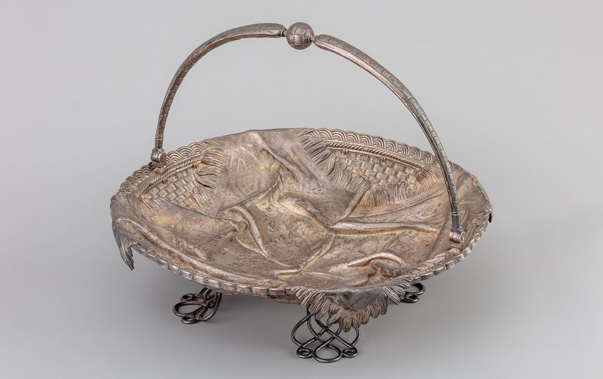 Сухарница серебряная круглая, в форме неглубокой плетёной корзины, на которую небрежно наброшена чеканная салфетка с резьбой, воспроизводящей узорчатую ткань с бахромой. Ножки в виде тонких скруглённых прутьев. Ручка подвижная, на шарнирах, дугообразная, в центре имеющая утолщение в форме плетёного шарика.