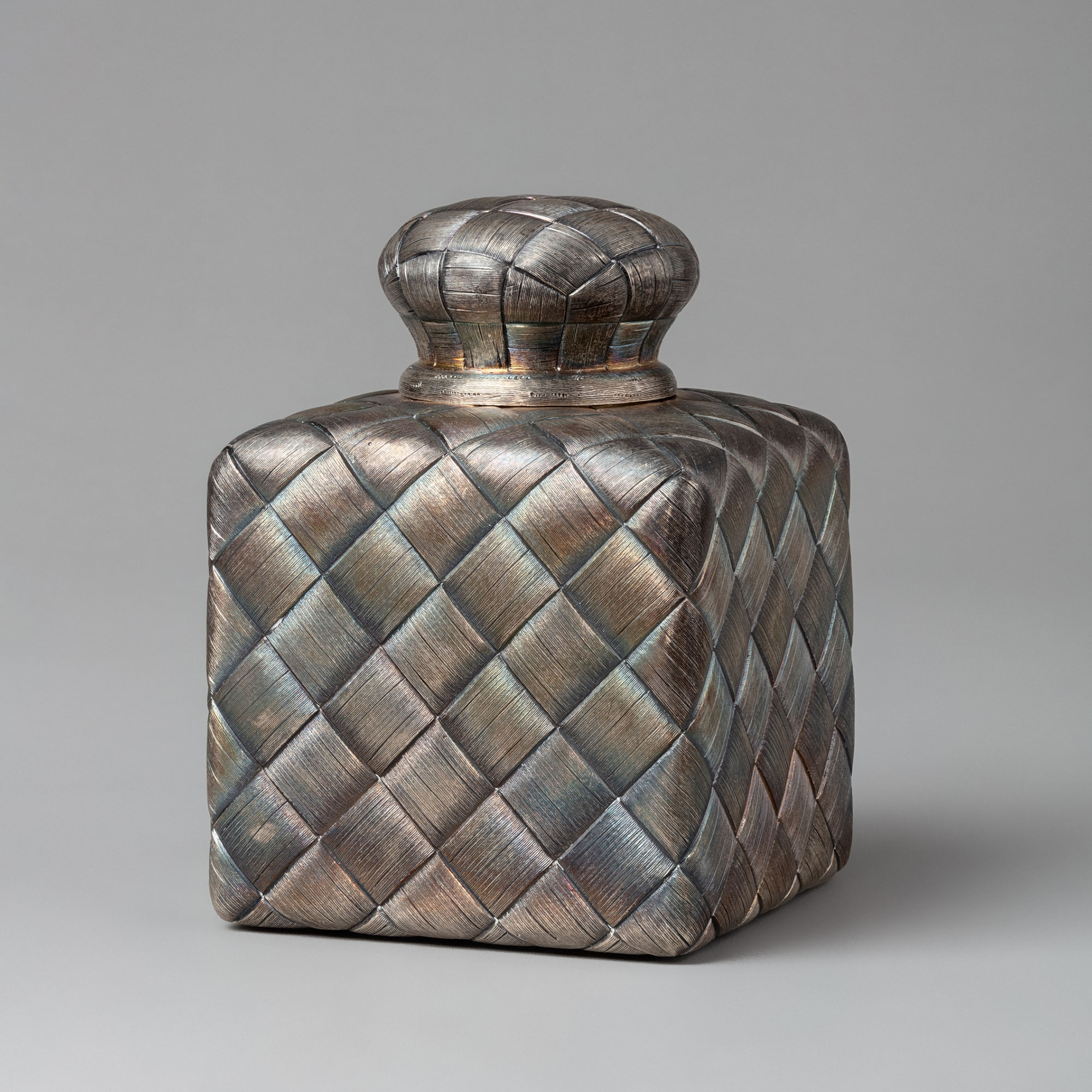 Чайница квадратной формы, с круглой съёмной крышкой. Она выполнена в технике чеканки, имитирующей в серебре берестяное плетение, — любимого художественного приёма отечественных мастеров золотого и серебряного дела на протяжении всей второй половины XIX века.