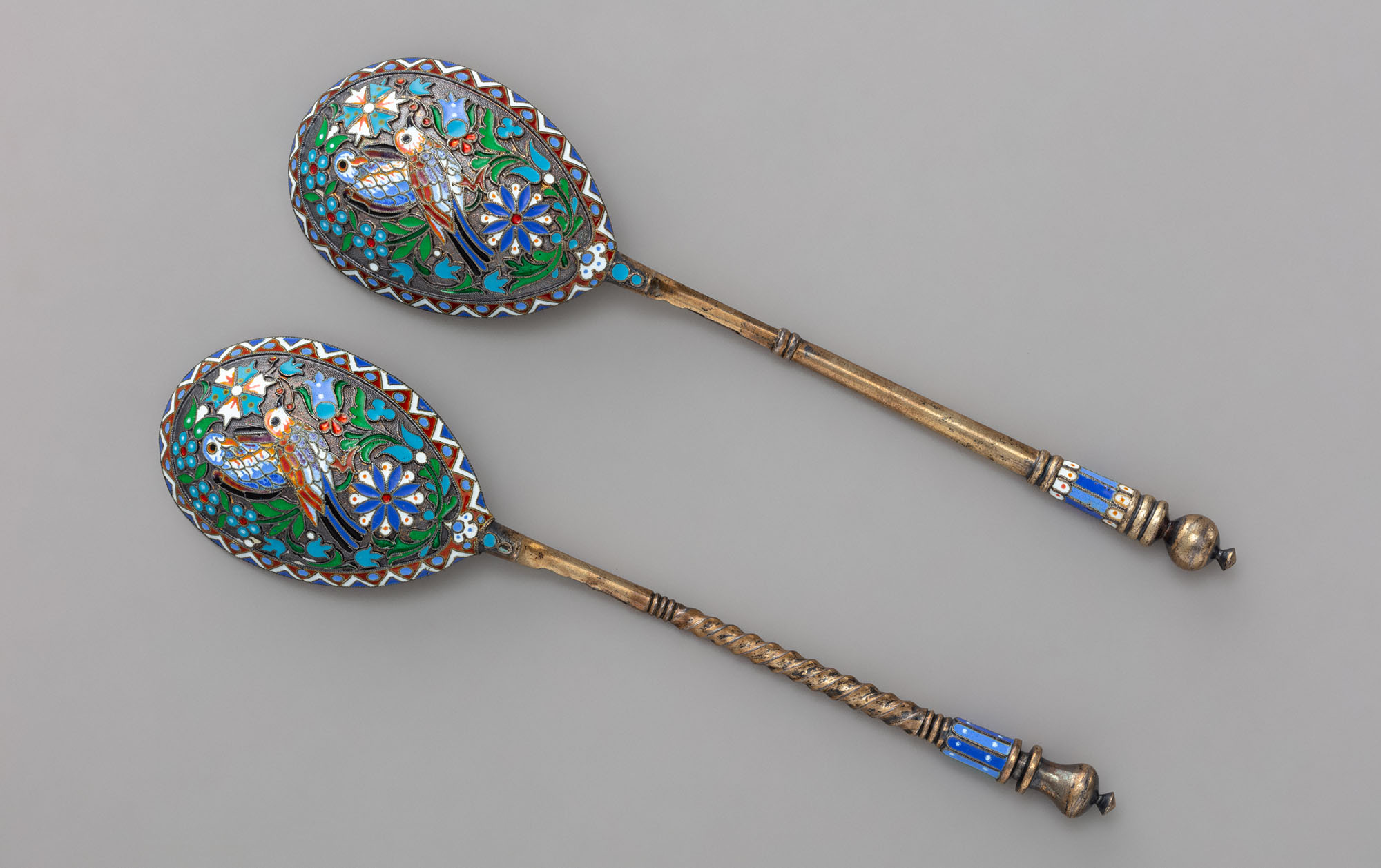 Овальные чашечки ложек украшены в центре изображением двух сидящих птиц в окружении стилизованного растительного и цветочного орнамента. Разделённые сканой косичкой ячейки рисунка заполнены полихромной эмалью. Контрастная гамма её чистых звенящих цветов своей необыкновенной праздничностью и нарядной декоративностью ассоциируется с искусством XVII столетия, которое служило для мастеров русского стиля неисчерпаемым источником вдохновения.