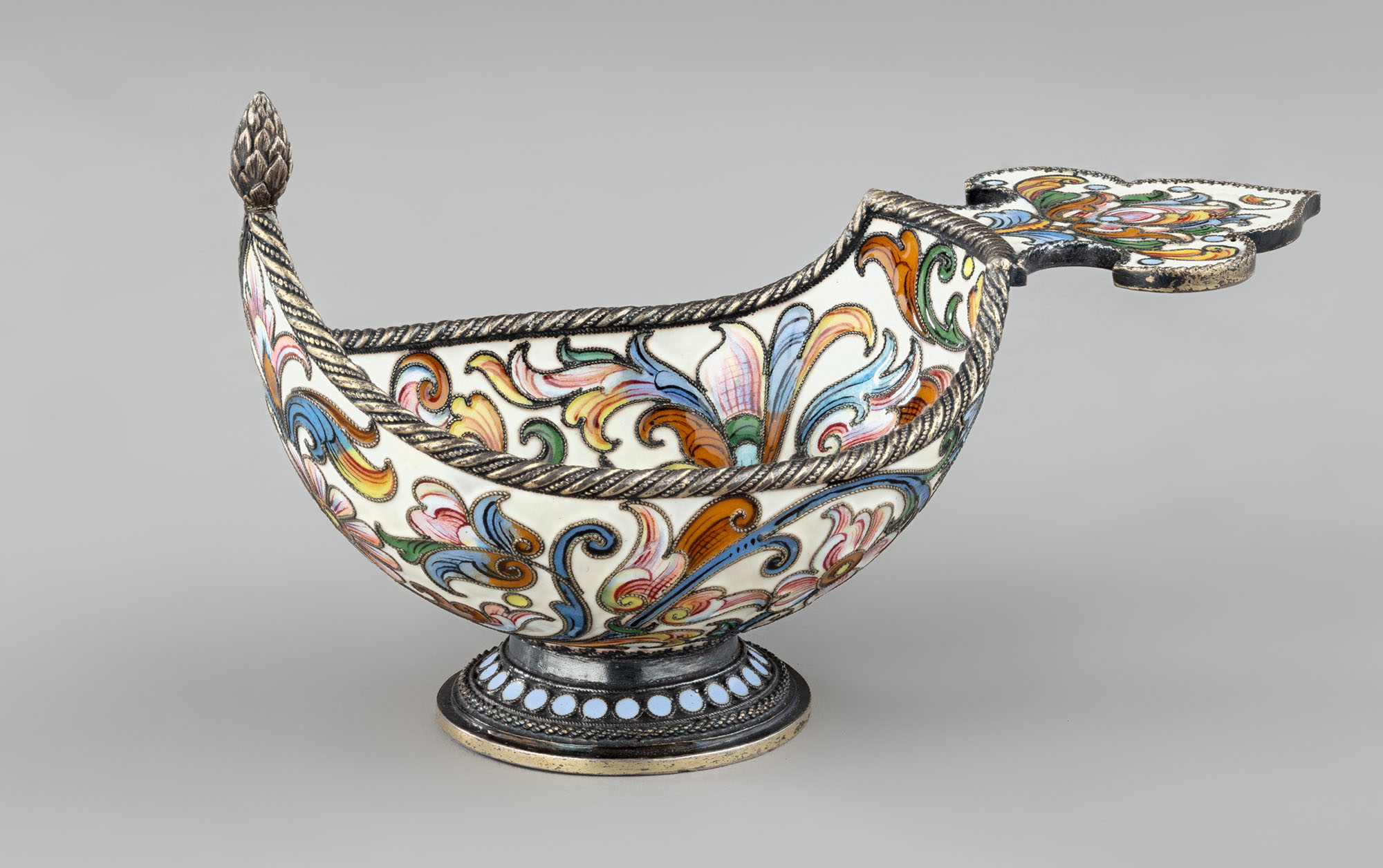 Корчик на круглой ножке, украшенный эмалевым растительным узором внутри и снаружи. Приподнятый носик увенчан сосновой шишечкой, бортик оформлен в виде витого жгута, плоская фигурная ручка декорирована цветной эмалью по скани.