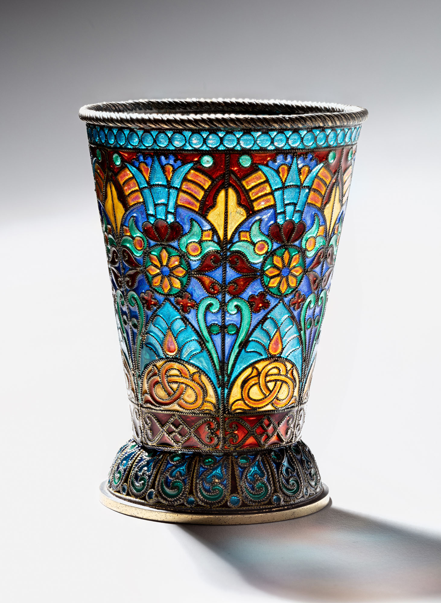 Небольшой стаканчик на круглом основании выполнен из тончайшей серебряной скани, заполненной полихромной витражной эмалью. Яркие цвета эмали (красный, синий, зелёный, жёлтый, голубой и оранжевый) соединяются в причудливом растительном и геометрическом декоре.