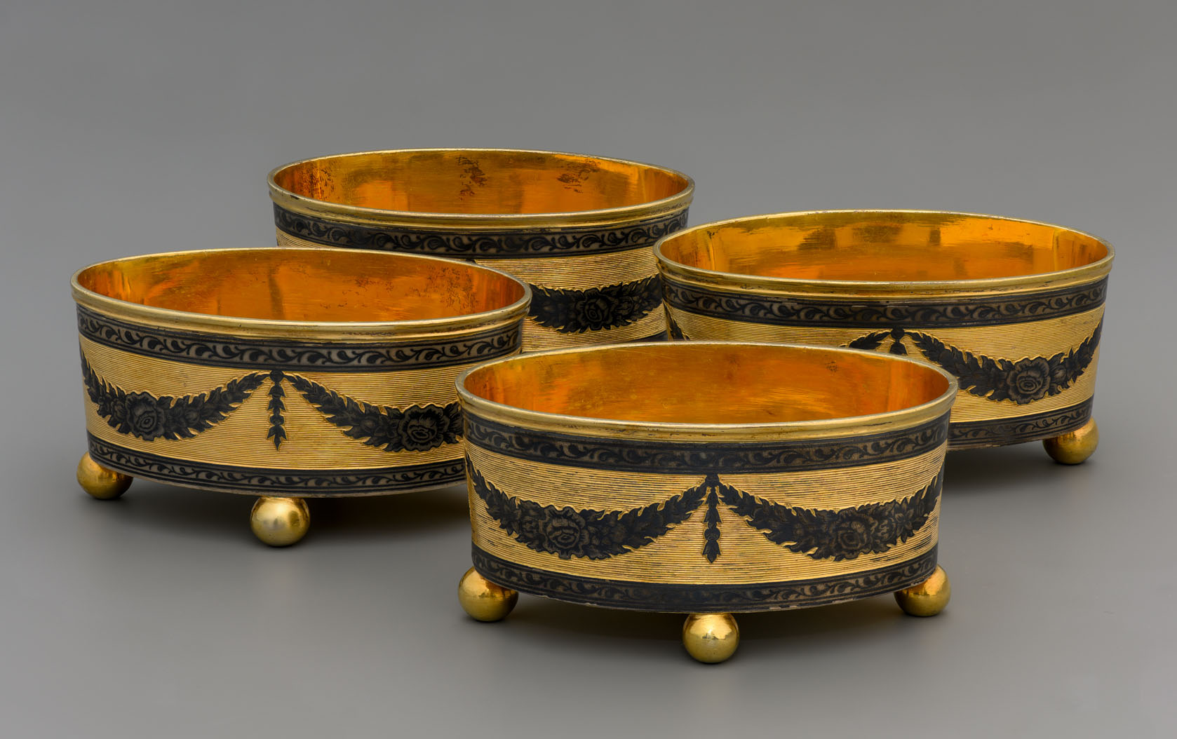 Солонки овальной формы на четырёх ножках-шариках были изготовлены в мастерской Ивана Петровича Жилина, одного из выдающихся мастеров черневого искусства Великого Устюга посл. четв. XVIII — нач. XIX в. Предметы отличаются высочайшим качеством черневого декора в виде опоясывающего тулово изящного орнамента из соединённых вместе лиственных гирлянд с украшающими их в центре крупными цветками розы.