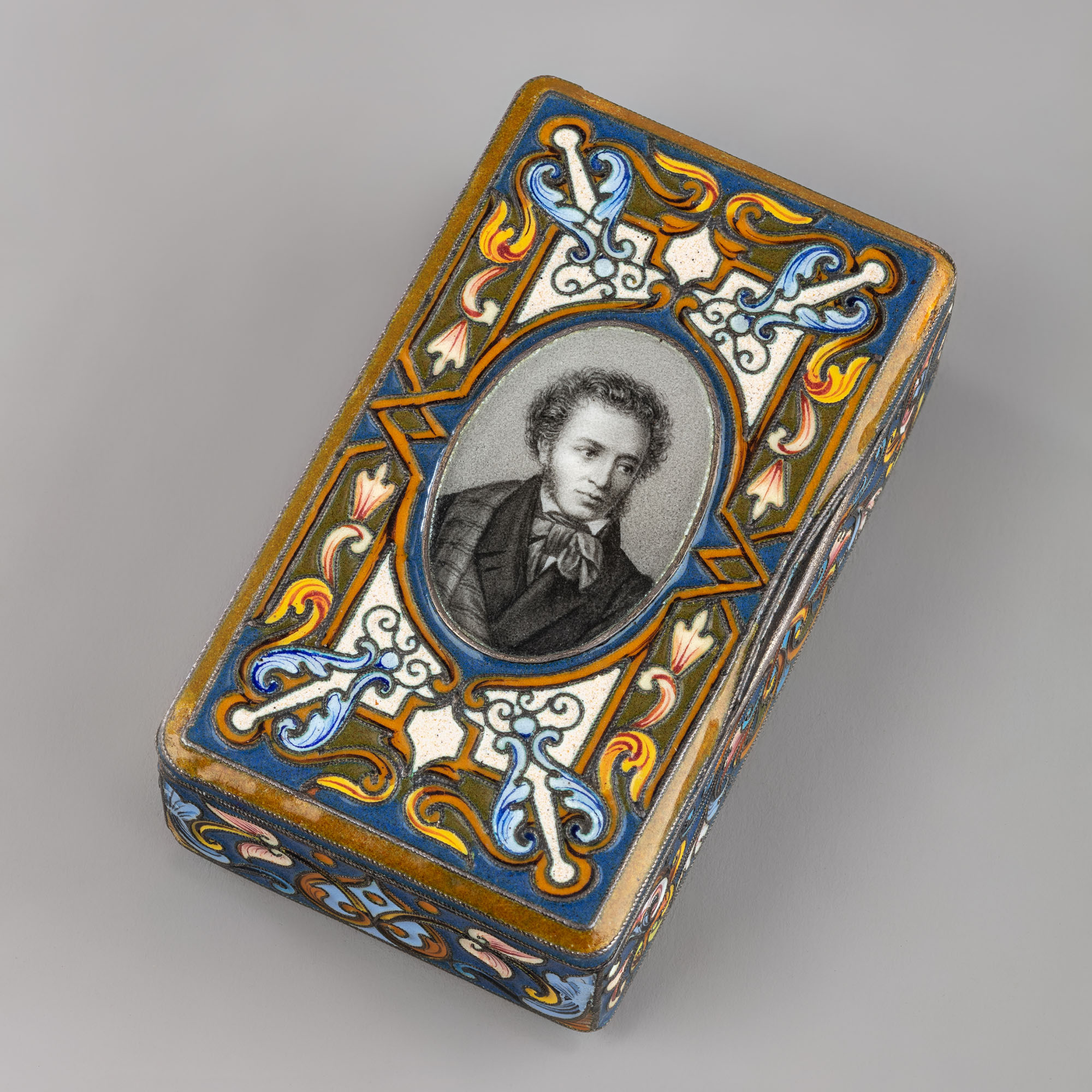 Небольшая прямоугольная коробочка с откидной крышкой на шарнире украшена многоцветными эмалями с растительными мотивами. На крышке помещён исполненный в монохромной технике гризайль овальный портрет А. С. Пушкина, восходящий к живописному оригиналу О. А. Кипренского (1827 г., Третьяковская галерея).