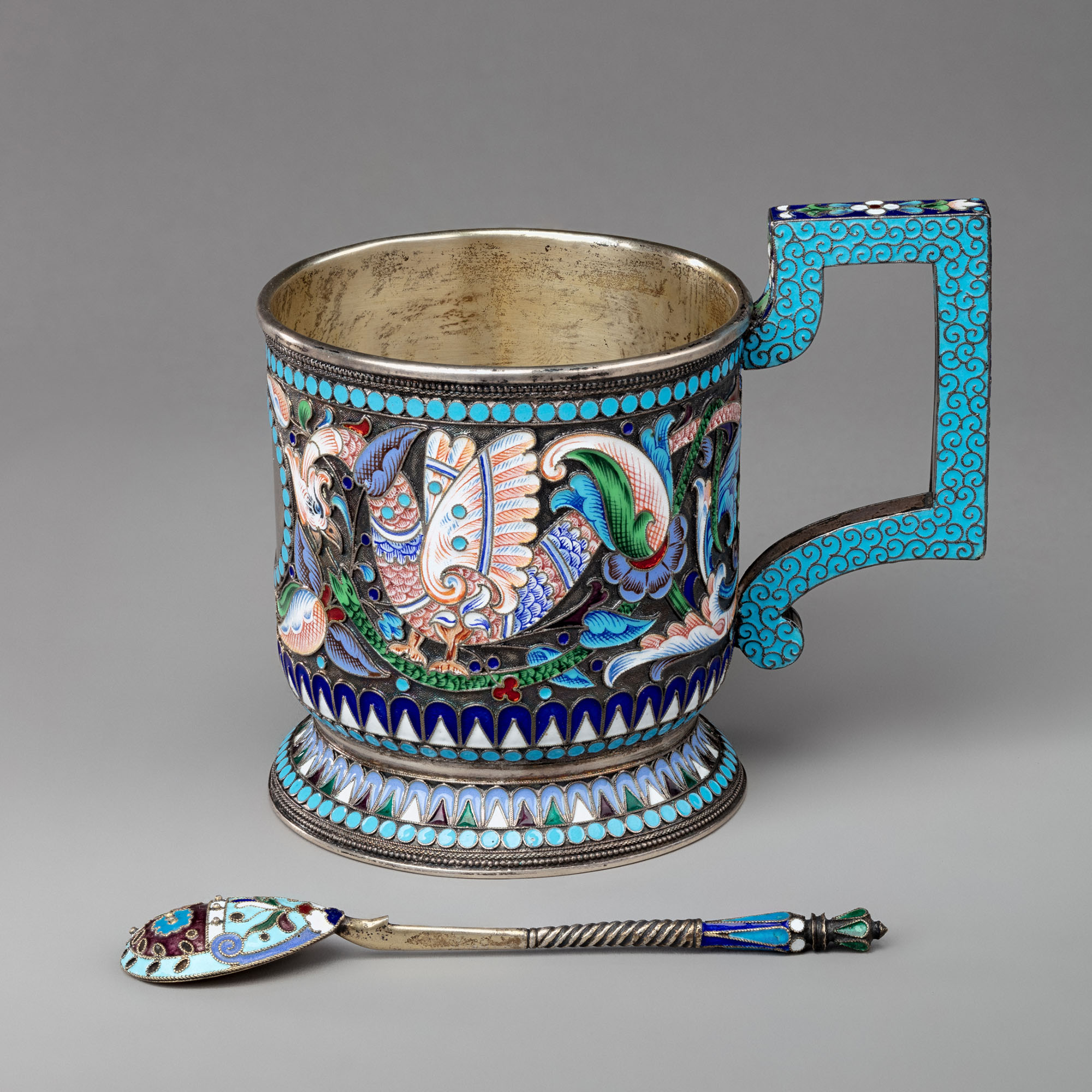 Серебряные позолоченные подстаканник и ложка украшены полихромным эмалевым декором. Богатство и красочность его мотивов характерны для лучших произведений московской эмальерной школы второй половины XIX века.