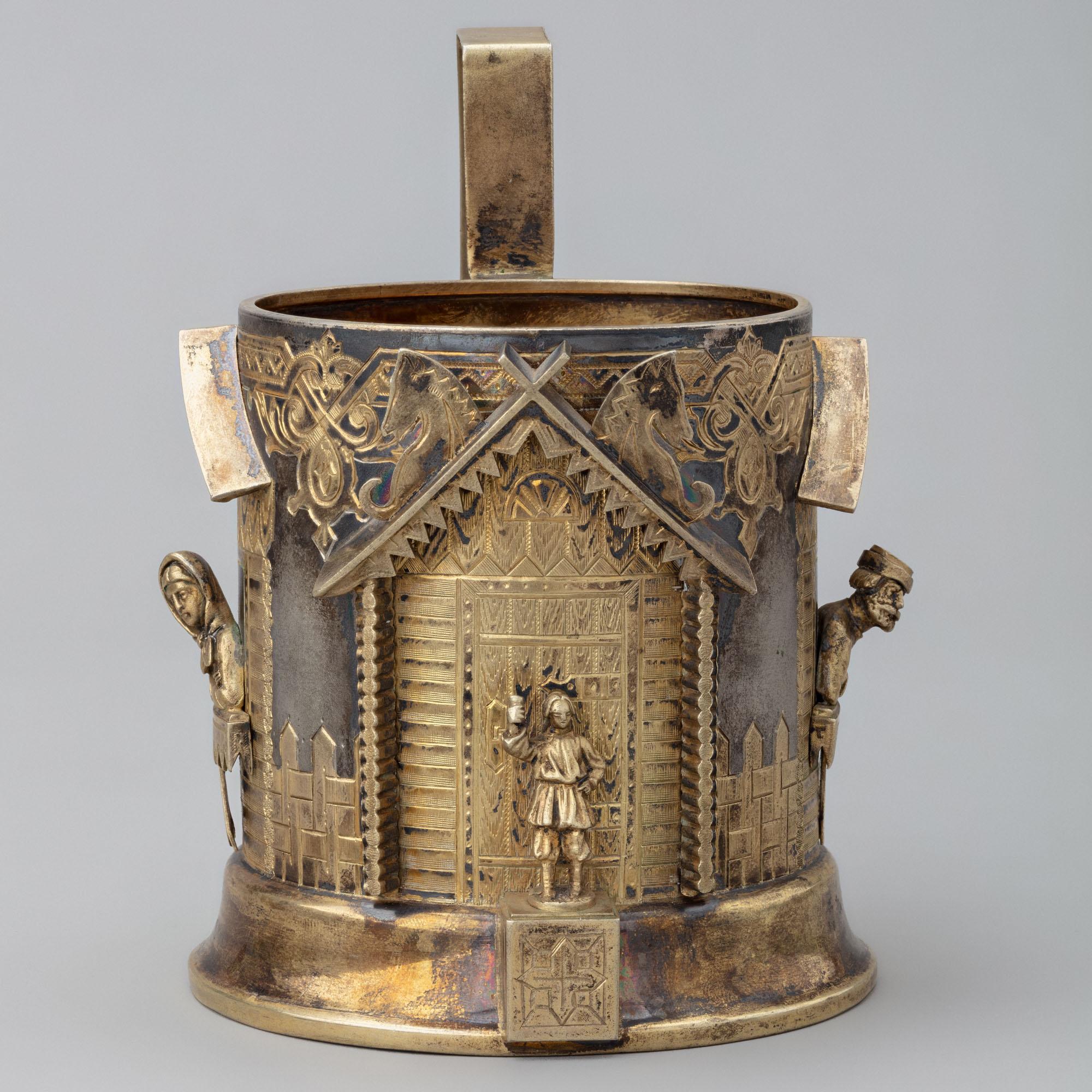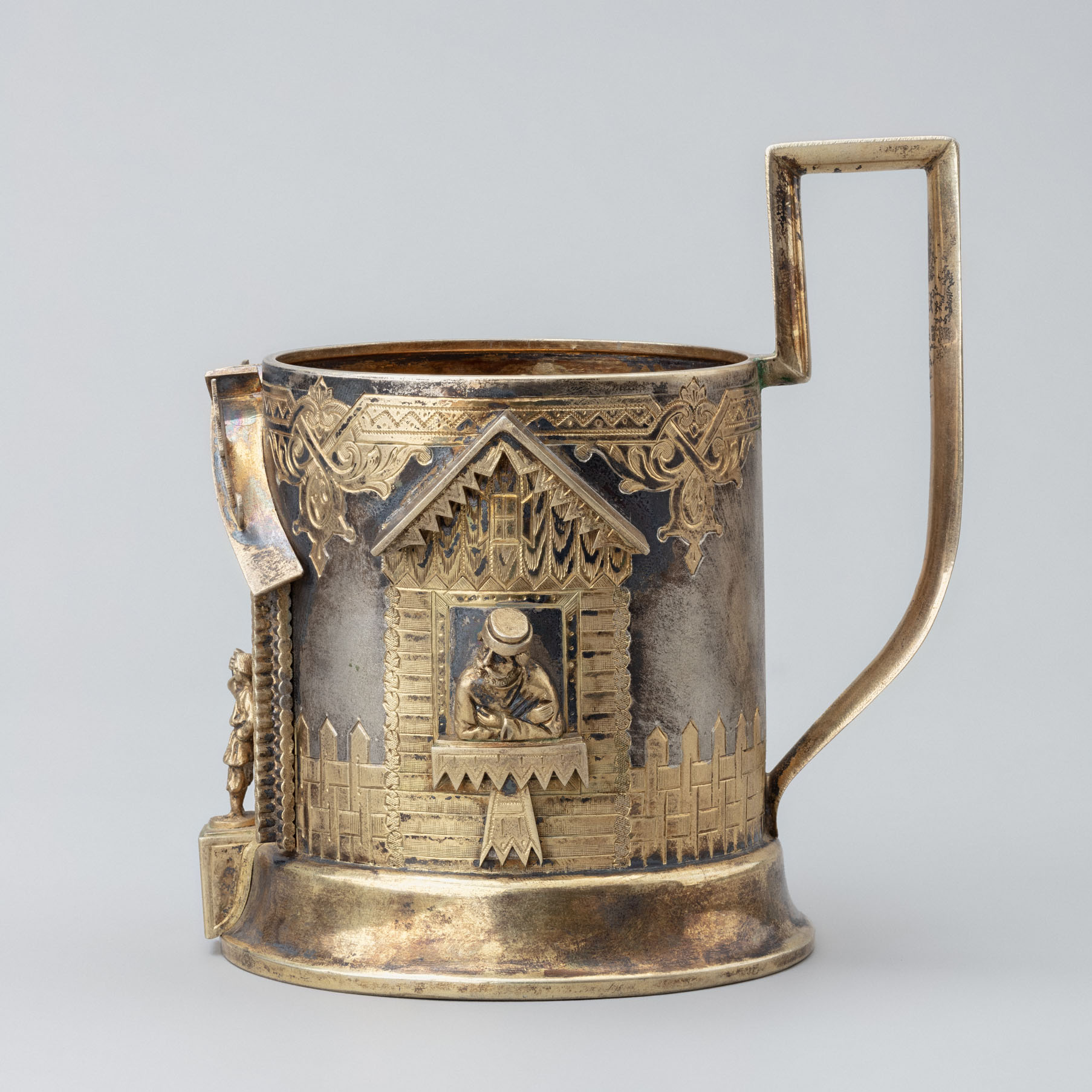 Декор подстаканника построен на эффектном сочетании гладкой серебряной поверхности тулова с гравированными и объёмными, накладными, густо позолоченными изображениями: с лицевой стороны — фасада избы с входной дверью, причелинами и коньками на них, перед которым расположена фигура одетого в подпоясанную рубаху и заправленные в сапоги шаровары молодого человека; с боковых сторон — смотрящих из украшенных наличниками окон бревенчатых изб крестьянина в шапке-«грешневике» и крестьянки в платке. Фрагменты соединены в общую композицию окружающими их по периметру: снизу — дощатым забором, сверху — полосой геометрического орнамента. Богатство декора дополнено яркой позолотой внутренней поверхности и высокой фигурной ручки.