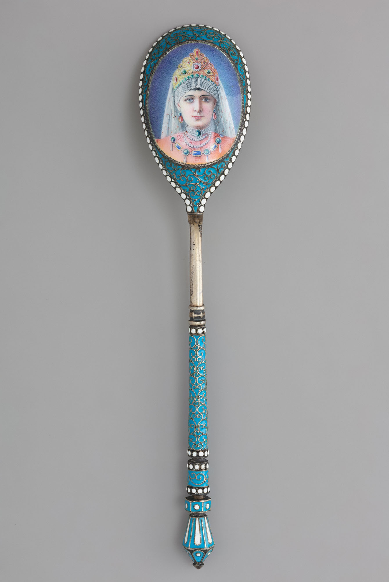 Десертная ложка с цилиндрическим черенком и овальной, сужающейся у основания чашечкой. Верхняя часть черенка и внешняя сторона чашечки украшены окружённым полосами из кружочков белого цвета сканым гипюром на бирюзовом эмалевом фоне. В центр чашечки помещён обрамленный сканой косичкой овальный медальон с изображением женщины в богатом боярском наряде, выполненным в технике живописи по эмали.