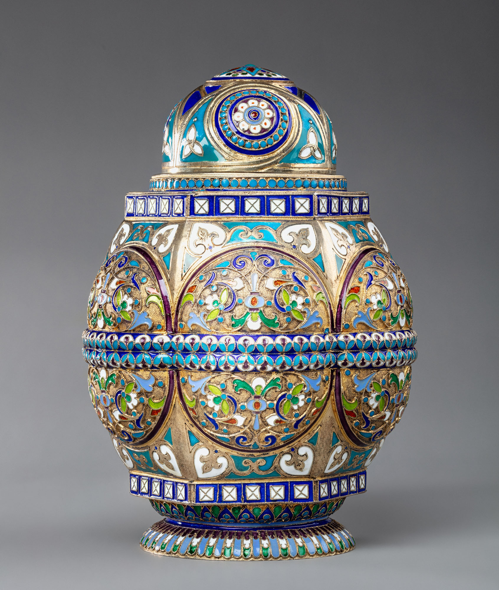 Яйцевидная серебряная золочёная чайница со съёмной куполообразной крышкой богато декорирована полихромными эмалями. В цветовом решении преобладают синие, голубые и бирюзовые эмали, характерные для работ А. И. Кузмичева конца XIX века.