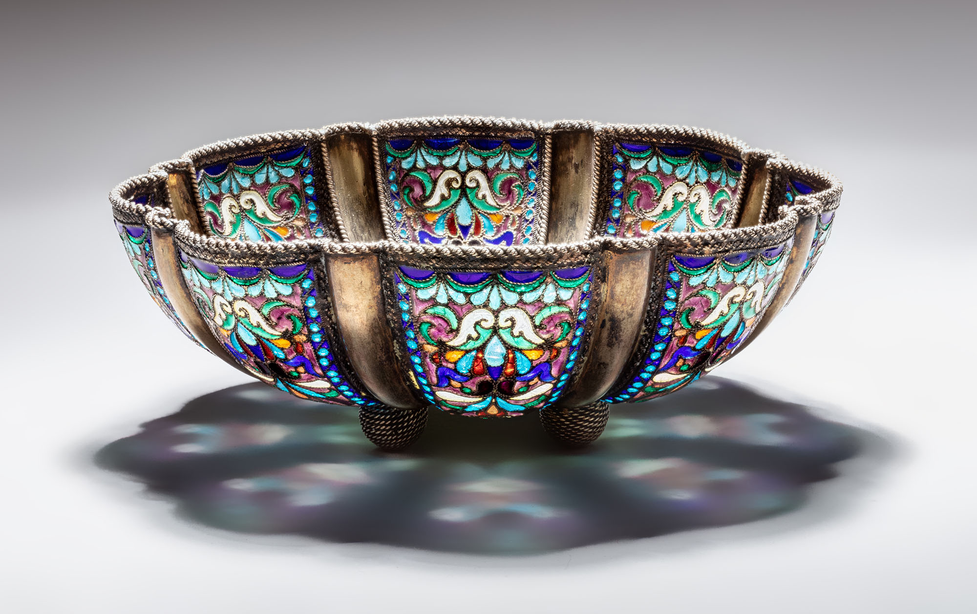 Серебро; литьё, чеканка, скань, витражная эмаль, эмаль, золочение