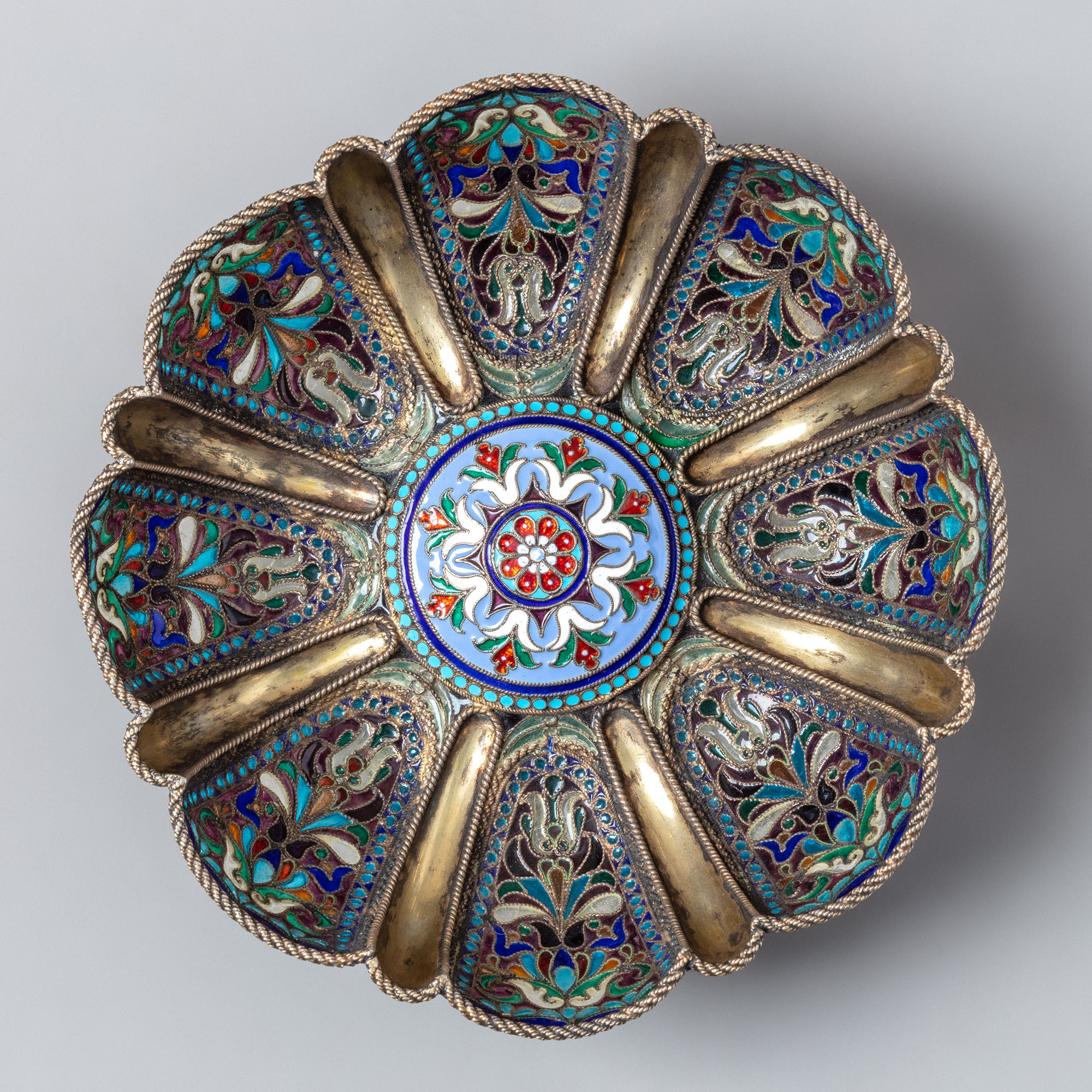 Конфетница золочёная, круглая, на ножках-шариках. Восьмилепестковый корпус прочеканен желобками и ложками, в которых заключён стилизованный сканый букет, заполненный полихромной витражной эмалью. На дне вазочки — круглая мишень с растительным эмалевым декором. Подобные конфетницы фирмы «Хлебниковъ» представлены в собраниях Музеев Московского Кремля и Государственного исторического музея.