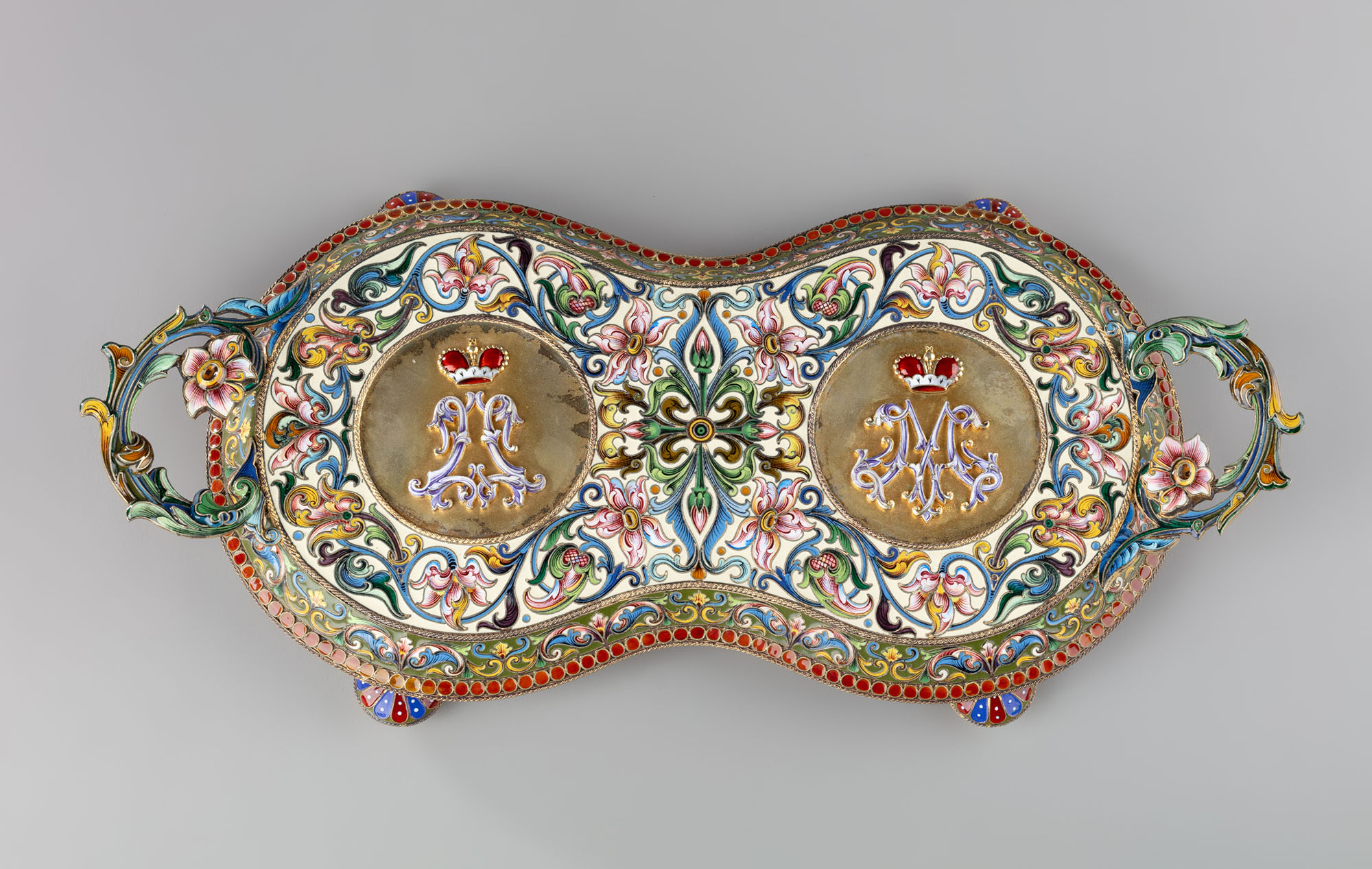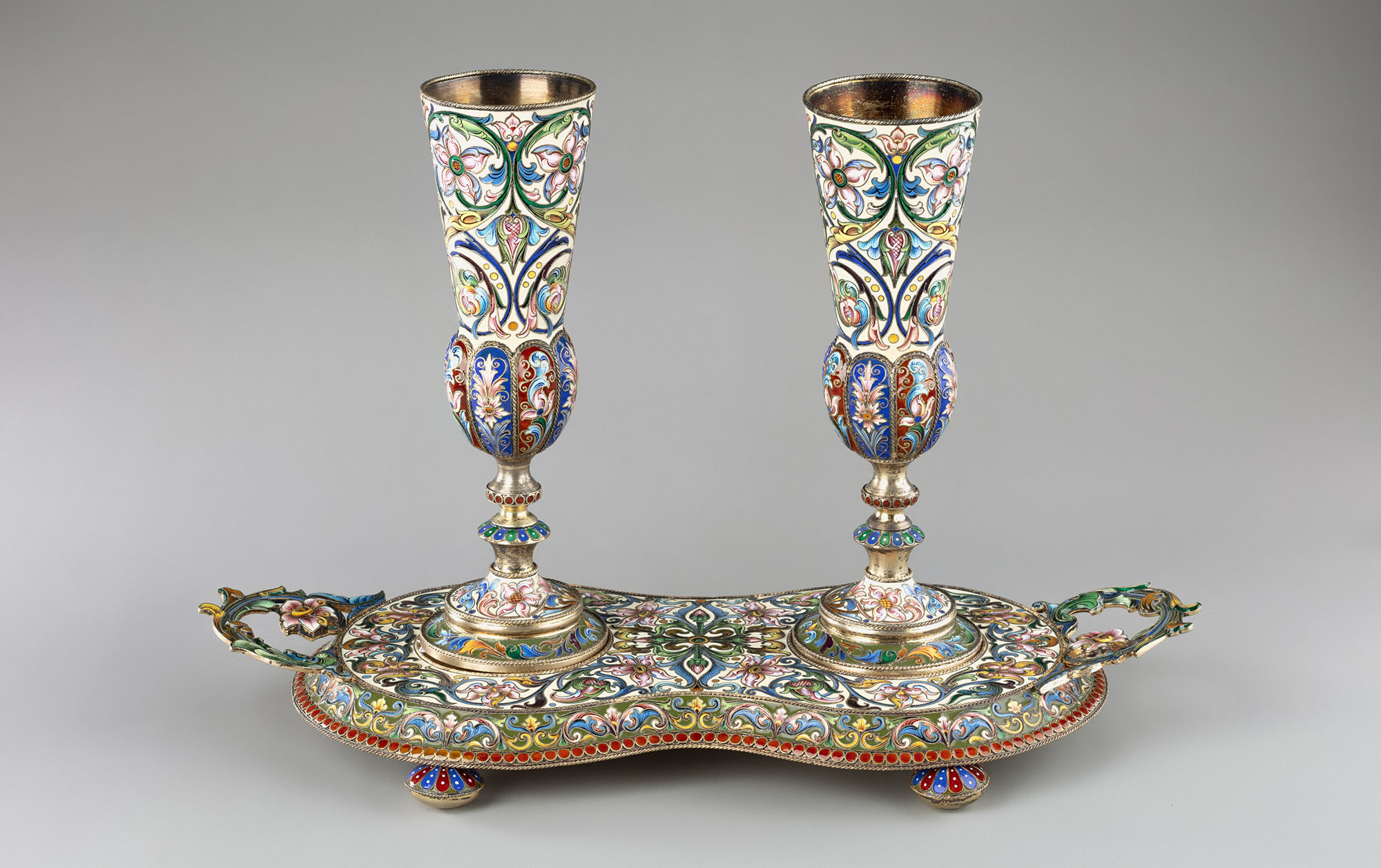 Набор для вина состоит из подноса и двух высоких бокалов. Все предметы украшены растительным узором, выполненным полихромной эмалью по скани. Расширяющиеся кверху бокалы завершаются многосоставными ножками на круглых уступчатых основаниях. Оригинальной формы поднос, покоящийся на четырёх круглых ножках, имеет элегантные ручки в виде побегов с листьями и распустившимися цветами. На подносе расположены две золочённые круглые мишени (подставки под бокалы), в центре которых помещены инициалы «А» и «М» под княжескими коронами.