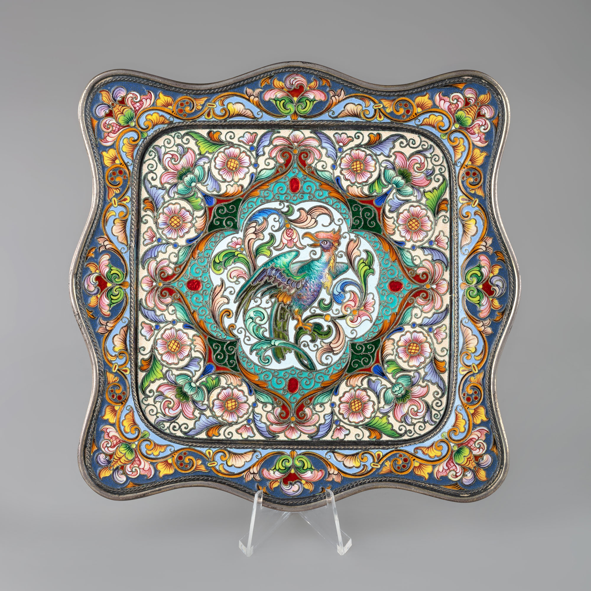 Поднос для визиток квадратный, с фестончатым краем, сплошь покрытый растительным эмалевым декором. В ромбовидном зеркале бирюзовой эмали, на нежнейшем голубом фоне, размещено изображение экзотической птицы с пёстрым эмалевым оперением.