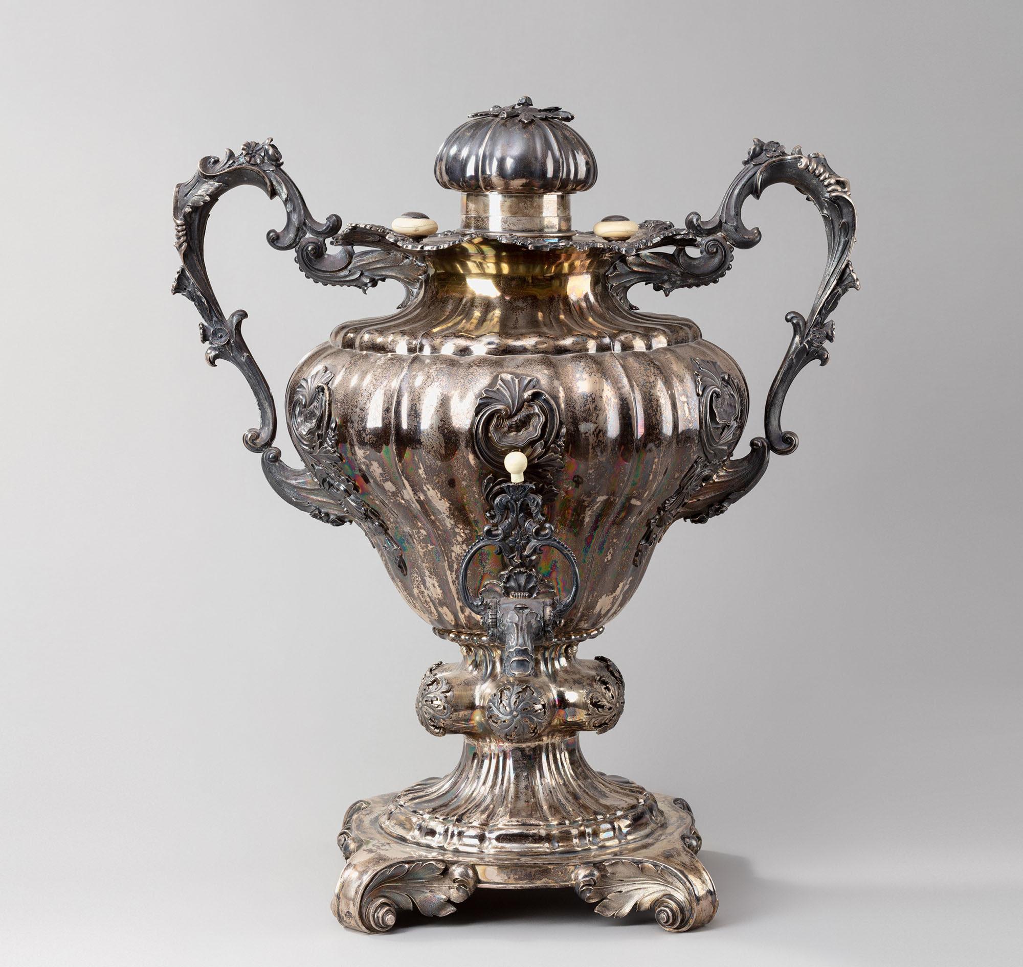 Серебряный самовар исполнен в стиле второго рококо, популярного в Западной Европе и России в 1830–1840‑е годы. Его грушевидный корпус имеет дольчатую структуру и декорирован рельефными накладками в форме раковин. Две высокие дугообразные ручки скомпонованы из растительных и цветочных мотивов, крышка выполнена в виде экзотического плода, кран имитирует лист аканта. Круглое основание самовара покоится на четыре ножках-завитках.