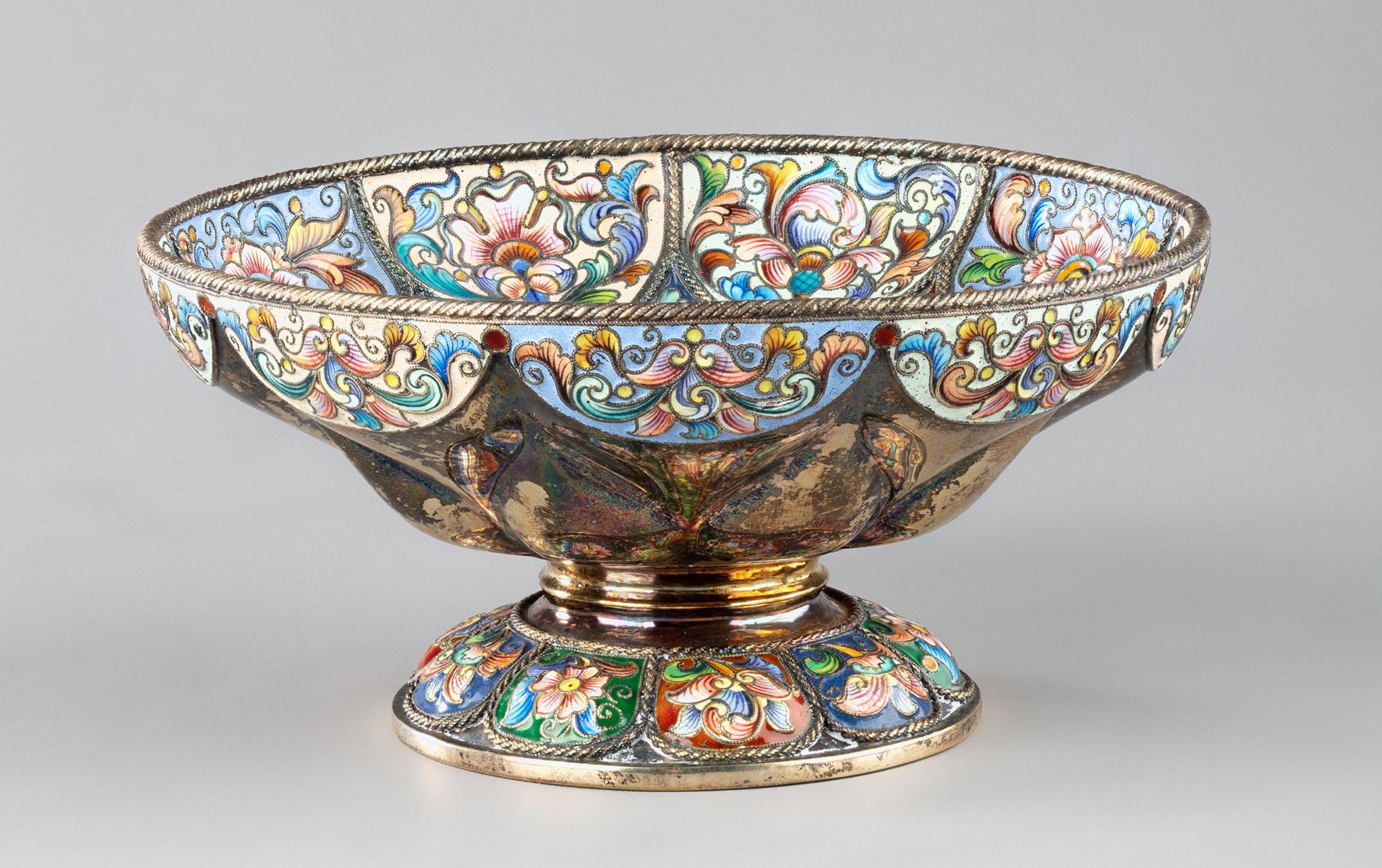 Серебро; литьё, чеканка, эмаль по скани, выемчатая эмаль, золочение