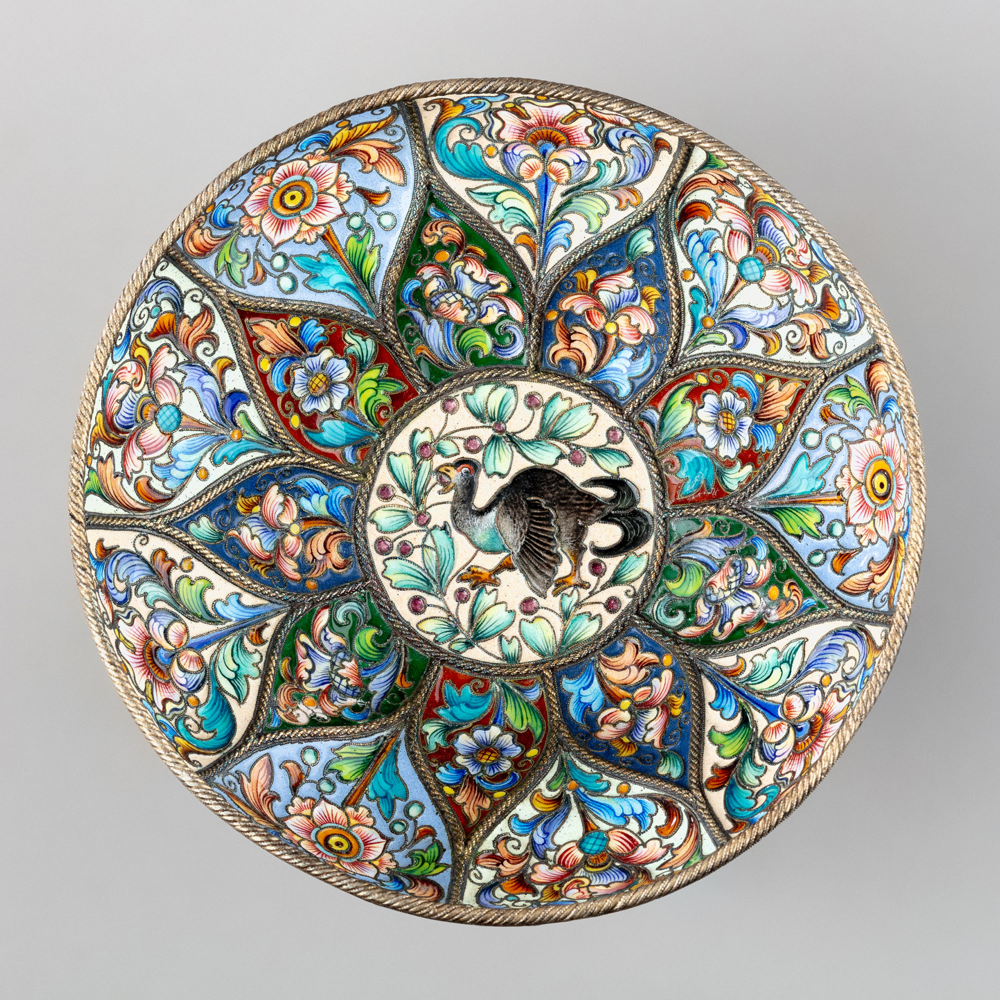 Чаша круглая на ножке, внутри сплошь покрытая растительным эмалевым декором, положенным по разделённым толстым сканым жгутом каплевидным долам. Внутри чаши — круглая мишень светлой эмали, в которой изображён тетерев, клюющий ягоды с ветки. Нижняя часть корпуса чаши вызолочена и отполирована. Куполообразная ножка также разделана на долы, украшенные красной, синей и зелёной эмалью с цветочным узором.