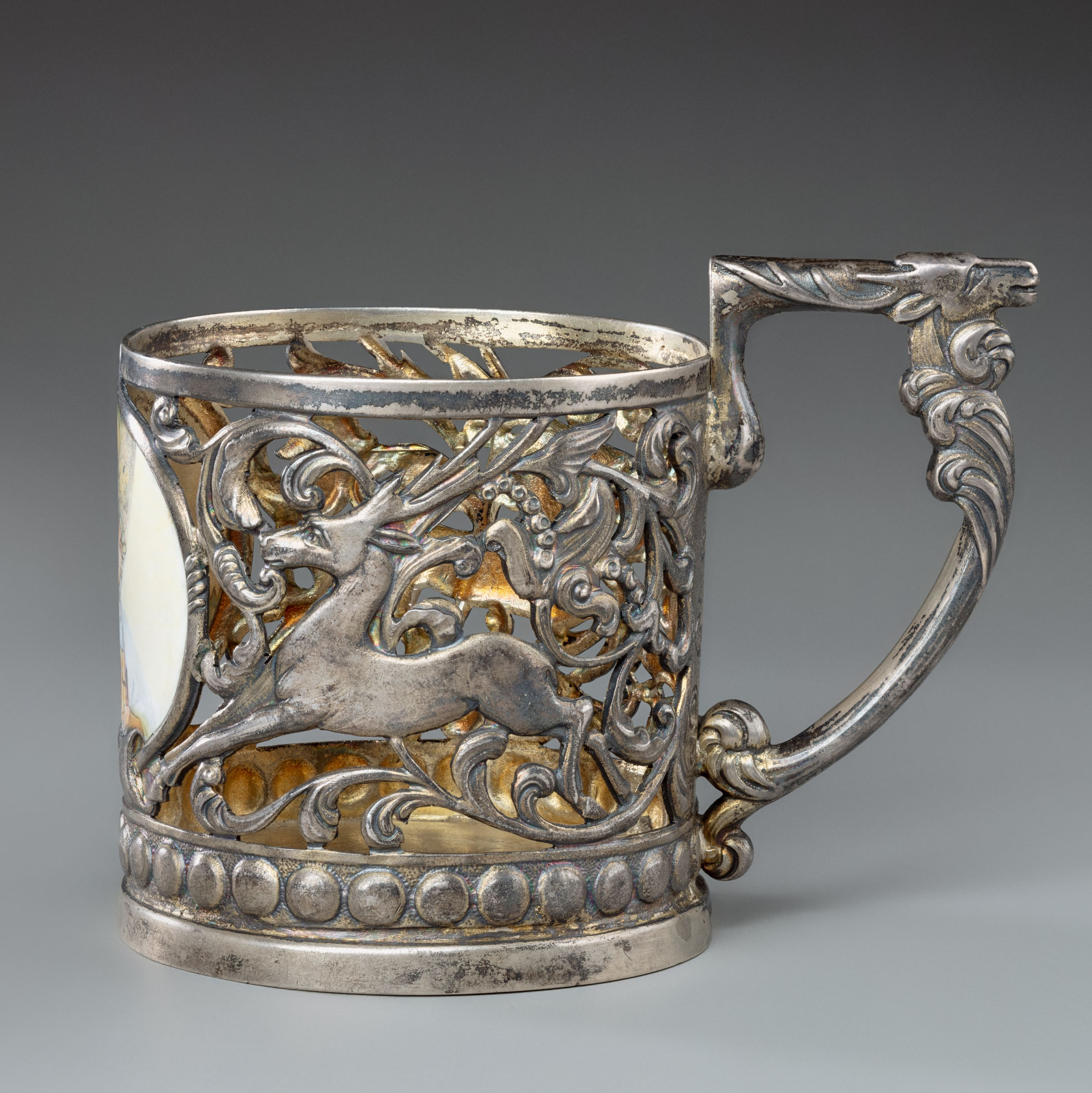 Ажурный декор серебряного подстаканника отличается динамикой и пластичностью форм, характерными для произведений эпохи неорусского стиля, испытывавшего на себе сильное влияние искусства модерна. Изображённые на корпусе фигуры бегущих оленей окружены ритмично изогнутым стеблем со стилизованными цветами и листьями на концах. Фигурная высокая ручка также выполнена в виде головы оленя, помещённой над вздымающимися волнами.