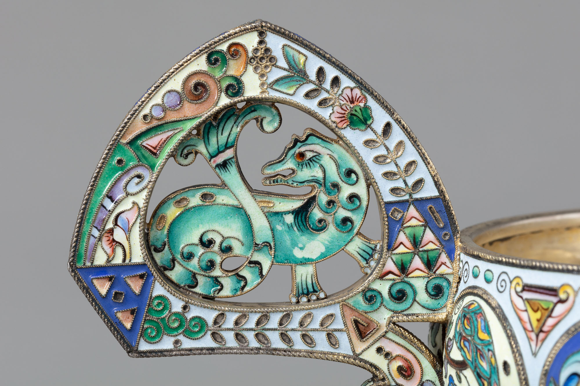 Ковш круглой формы с фигурной ручкой, сплошь покрытый полихромной эмалью. Корпус расчеканен круглыми долами, которые украшены павлинами, фантастическими рыбами и пёстрыми цветами (одна доля оставлена без эмали, серебряной). Большая часть корпуса покрыта цветочными и геометрическими узорами по светло-голубому эмалевому фону. Внутрь фигурной ручки вписана эмалированная фигура дракона.