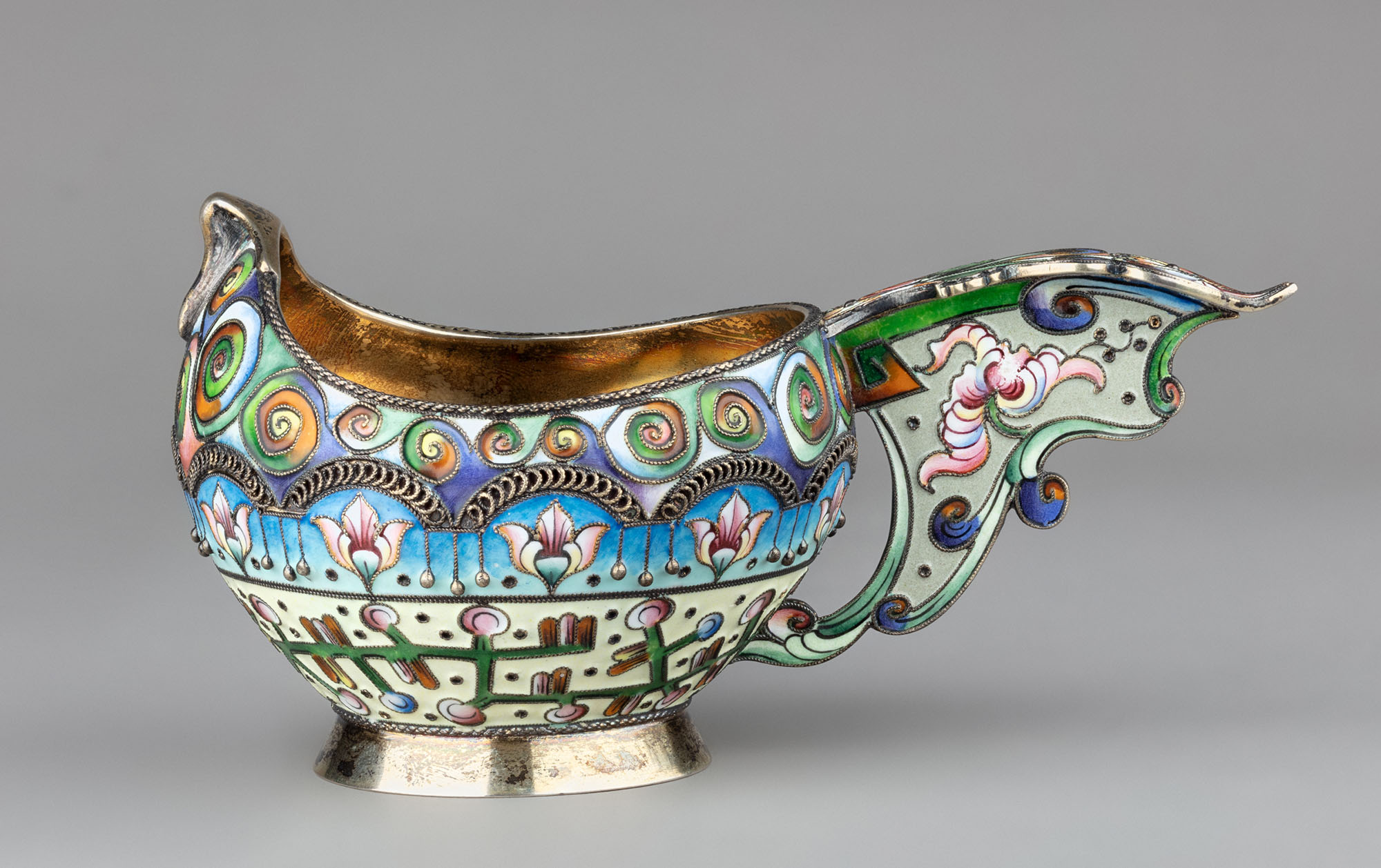 Небольшой ковшик с приподнятым носиком и мощной ручкой фигурной формы. Весь корпус и ручка покрыты полихромной эмалью пастельных тонов с растительными и геометрическими мотивами. По центру выпуклого корпуса проходит декоративный арочный элемент, состоящий из кольцеобразно свитой золочёной проволоки. Ниже, на проволочках-подвесах, группами размещены капельки зерни. Расширяющееся книзу круглое основание густо вызолочено и отполировано.