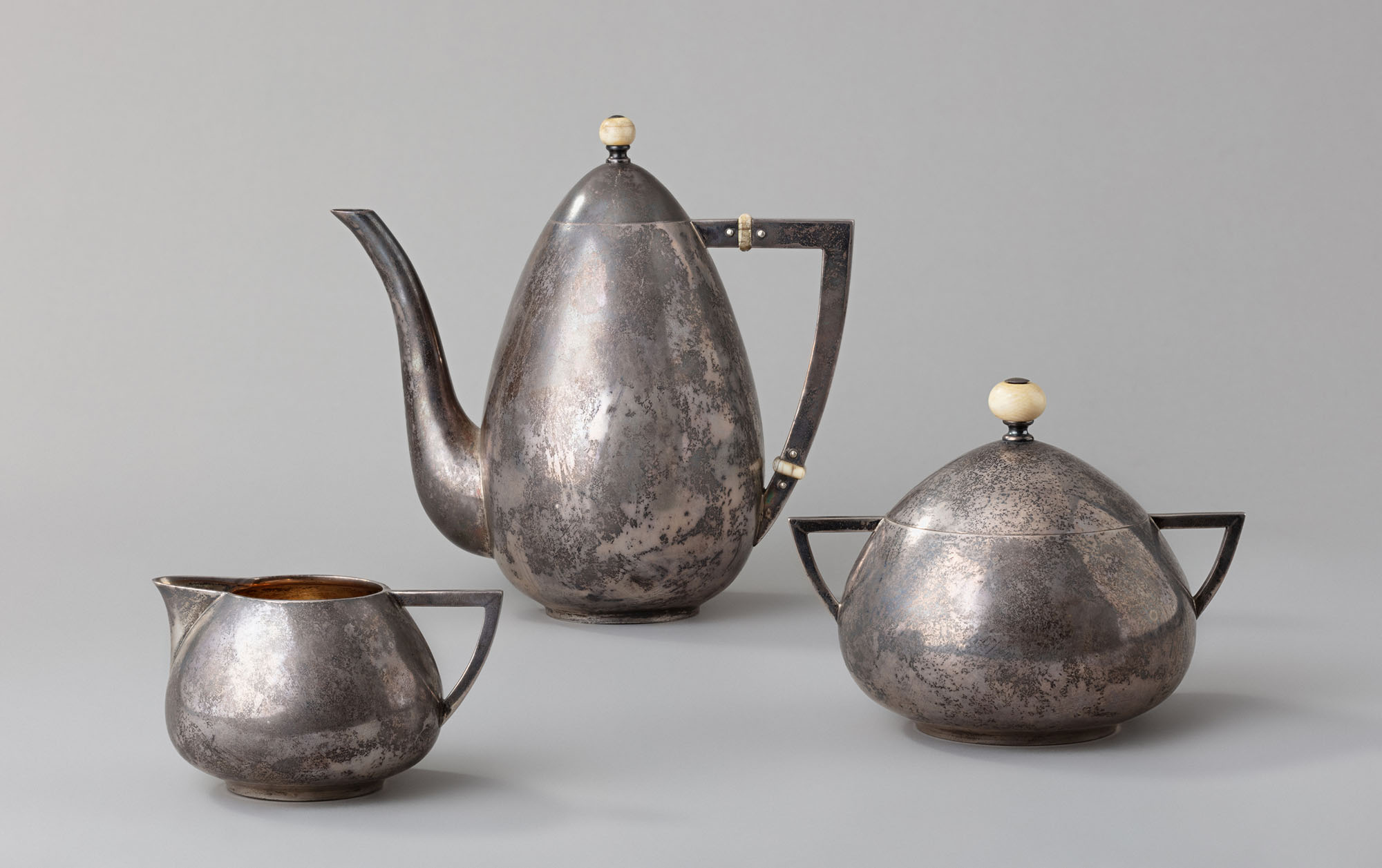 Изысканные формы чайника, сахарницы и сливочника построены на сочетании сдержанно-благородных овоидных пропорций тулова с элегантными треугольными, слегка скруглёнными ручками. Густая позолота внутренних частей предметов кажется ещё более яркой и насыщенной на фоне матового серебряного блеска внешних поверхностей и приглушённо-белого цвета костяных деталей.