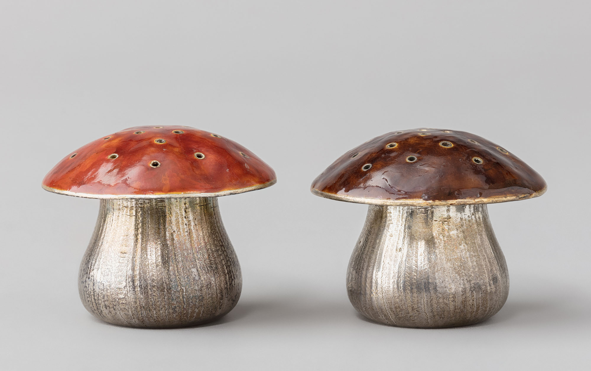 Набор для специй, состоящий из солонки и перечницы, сделан в виде приземистых боровиков со съёмными, покрытыми красной и коричневой эмалью, шляпками-крышечками. Виртуозно владея техниками эмалирования и гравировки, мастер сумел передать форму, окраску и текстуру этих грибов с их характерными прожилками на ножках и бархатистыми, чуть маслянистыми шляпками.