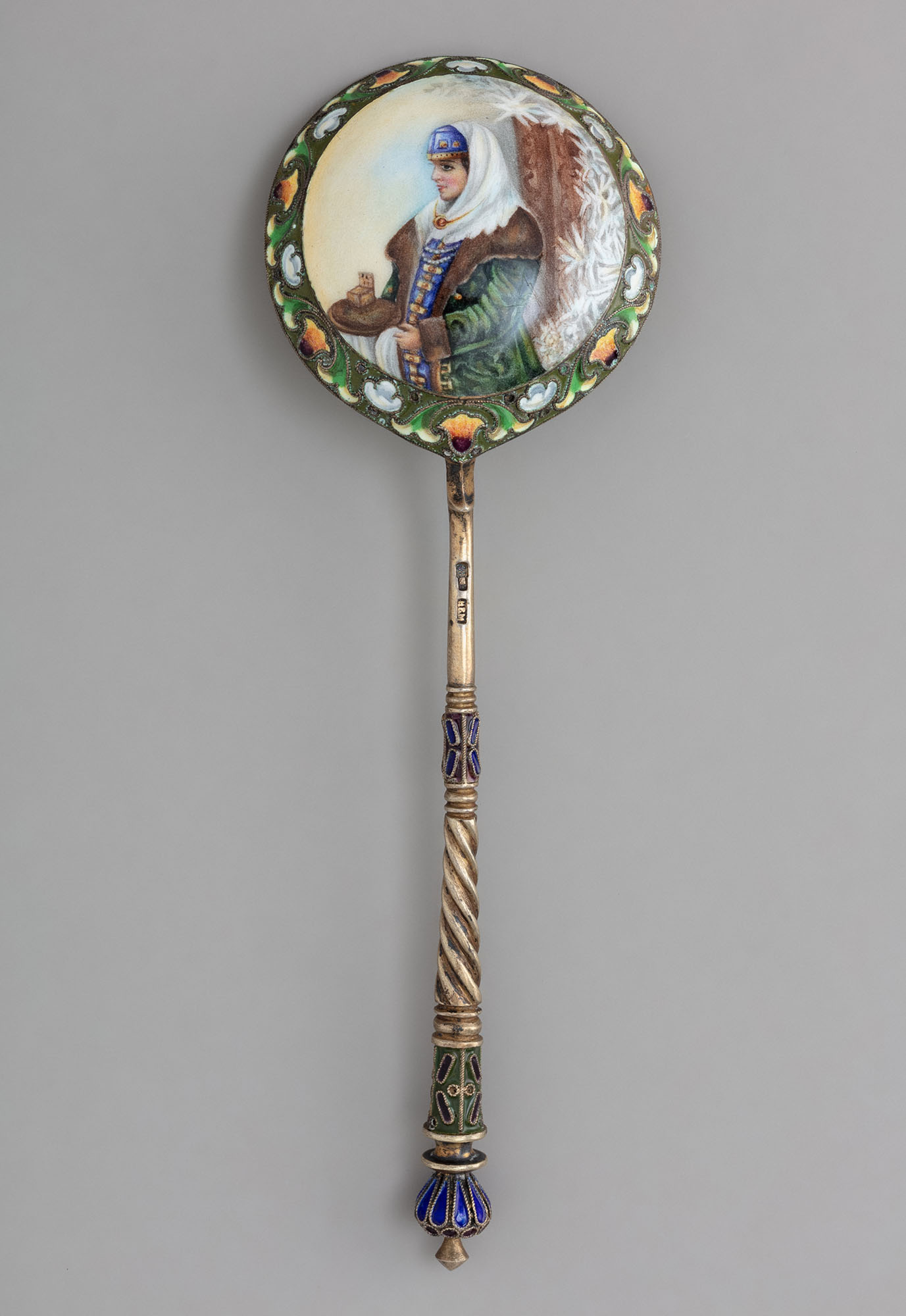 На круглой чашечке ложки помещено обрамленное полосой растительного полихромного орнамента изображение женщины в зимнем костюме боярыни, подносящей хлеб-соль, выполненное в технике росписи по эмали. Сюжет, заимствованный, вероятно, с живописного оригинала, неоднократно воспроизводился на предметах русских серебряников конца XIX — начала ХХ в. Примерами могут служить ковш Четвёртой московской артели 1908–1911 гг. (Аукционный дом «Александр». Аукцион частных коллекций № 5, 12 декабря 2024 г. лот 232) и ковш фирмы О. Ф. Курлюкова 1908–1917 гг. из частной коллекции, представленный на выставке «Карл Фаберже и Фёдор Рюкерт. Шедевры русской эмали» (Музеи Московского Кремля. 2020 г.)