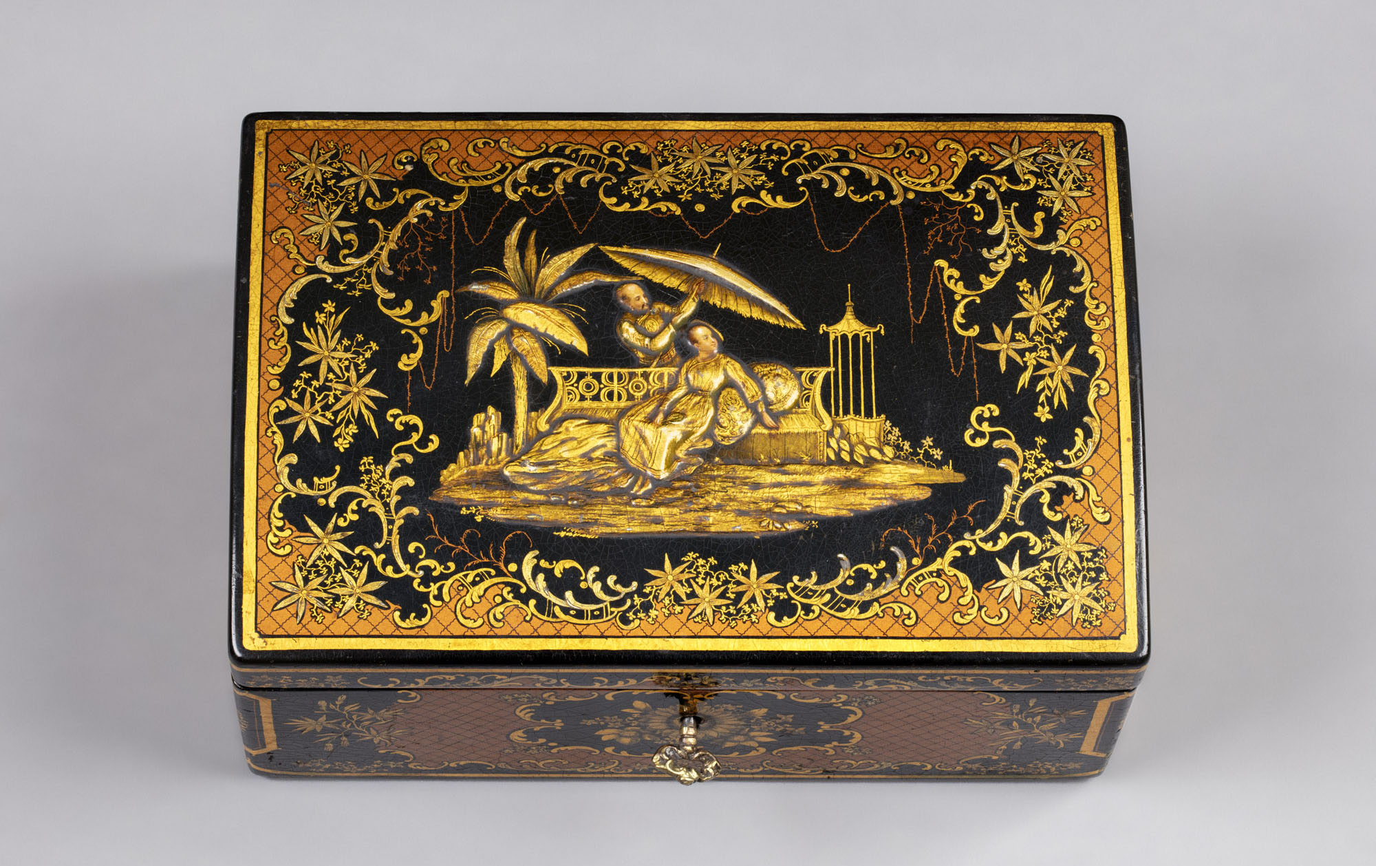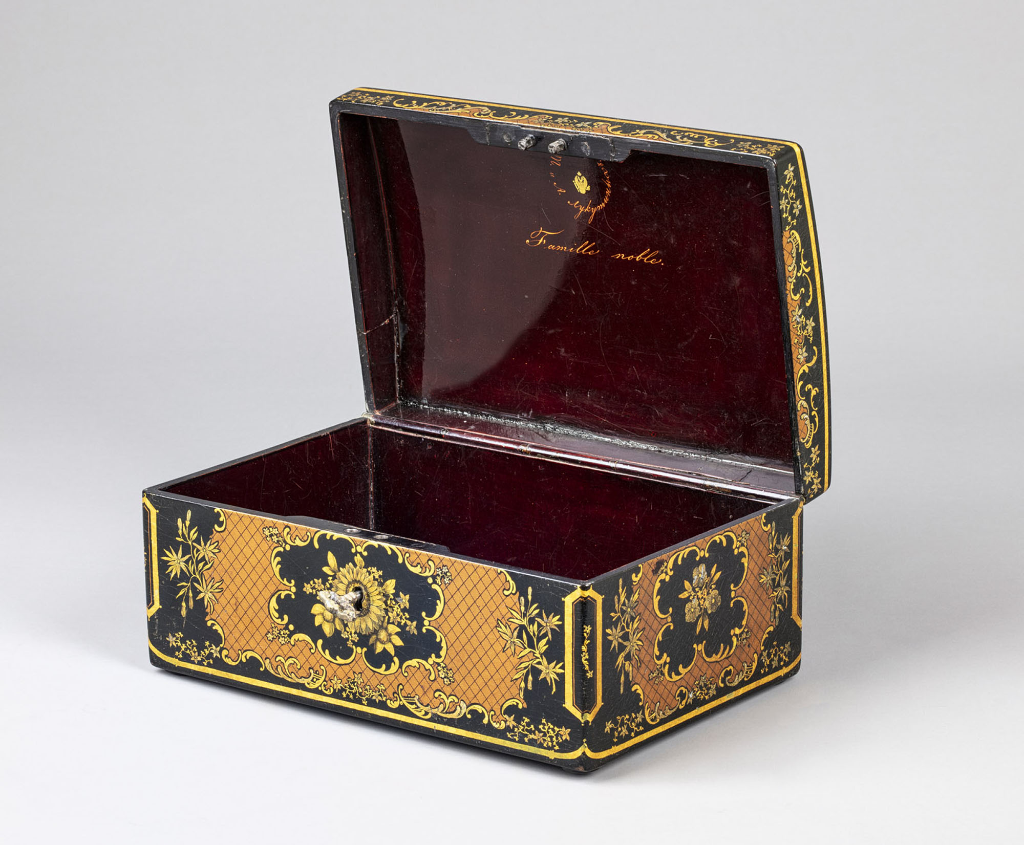Папье-маше, мастика, роспись маслом и золотом, лак, железо, латунь, литьё (замок и ключик)