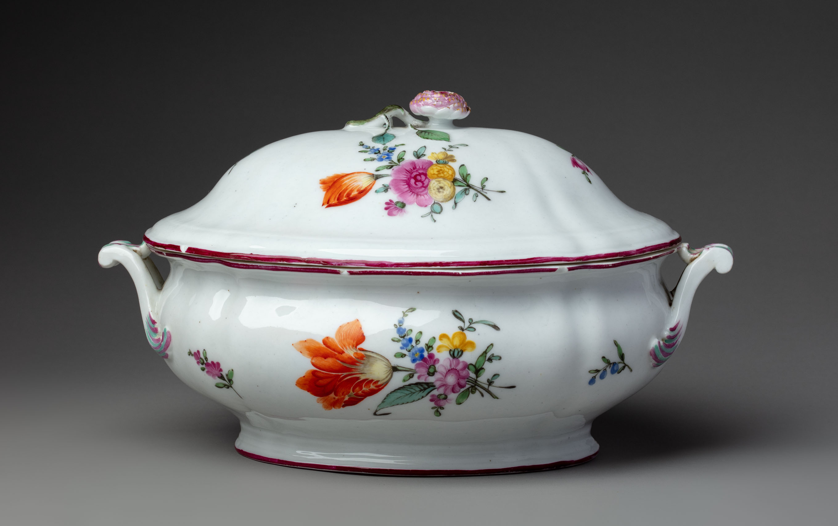 Одна из наиболее характерных черт в цветовом оформлении изделий завода Гарднера — преобладание малиновой краски. Этой краской писались цветы (шиповник, розы), раскрашивались ленты, лежащие по борту тарелок или спадающие складками от скульптурного украшения на крышке, оформлялись основания и выдающиеся части ручек и носиков посуды, подкрашивались скульптурные розочки на крышках сосудов, делалась отводка и орнамент по борту, а также закрашивались края бортов и оснований почти всей посуды. Эта характерная черта в живописном оформлении изделий XVIII века облегчает их классификацию и определение как изделий завода Гарднера и объясняется главным образом техническими и коммерческими соображениями. Завод ставил своей задачей выпускать посуду, доступную для широких слоёв населения. Позолота же употреблялась только в заказных предметах для орнамента и отводок.