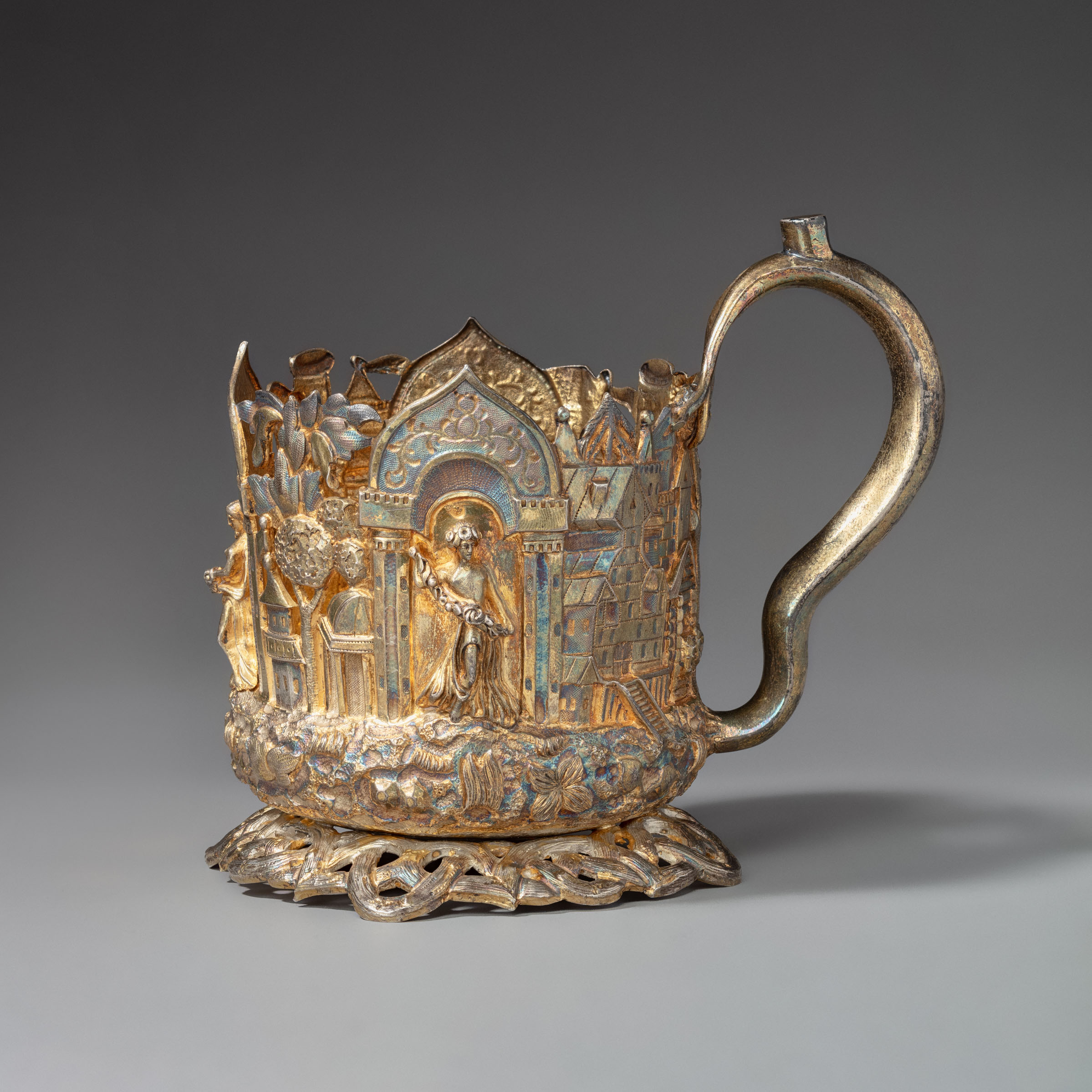 Тулово подстаканника украшено рельефным изображением стилизованного архитектурного пейзажа с тремя возвышающимися килевидными арками, внутри которых расположены объёмные женские фигуры, держащие в руках: гирлянду, составленную из плодов; серп и сноп пшеницы; корзину и связку фруктов. Олицетворяющие плодородие и изобилие, они являются аллегорическим пожеланием достатка и благополучия владельцу этого роскошно украшенного подстаканника.