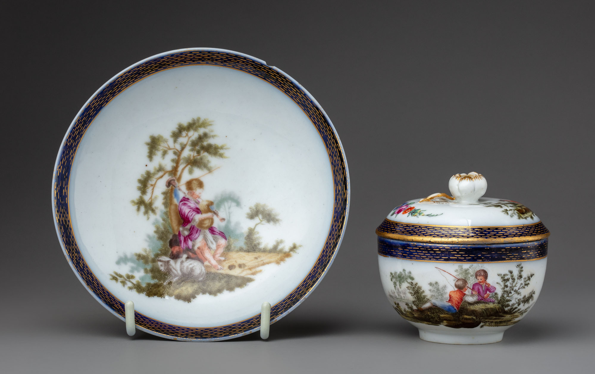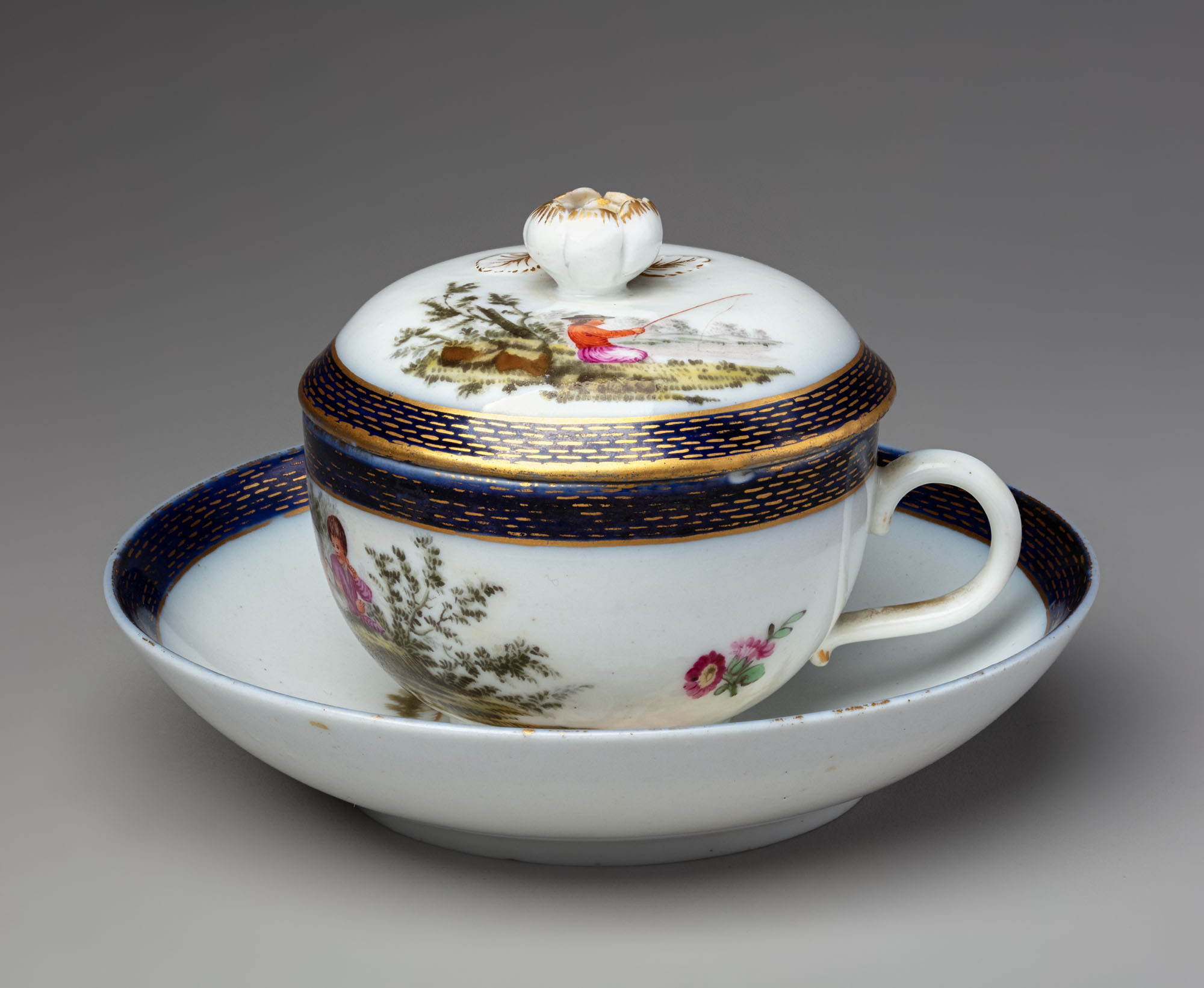 Подарочная чашка с крышкой и блюдцем представляет собой прекрасный по качеству и сохранности образец фарфора завода Франца Гарднера 1780‑х годов. Изделие на высоком уровне повторяет образцы Мейсенской королевской мануфактуры в Саксонии. Это относится как к форме, так и пасторальному декору. Верх чашки, края блюдца и крышки декорированы широкой кобальтовой полосой с прорисованным по нему золотым пунктиром — декором «гильоше». Подобный мотив, как и в целом роспись кобальтом, редко встречается в гарднеровской продукции. У Гарднера таким орнаментом декорировали наиболее дорогие изделия с сюжетной росписью, а также подарочные чашки.