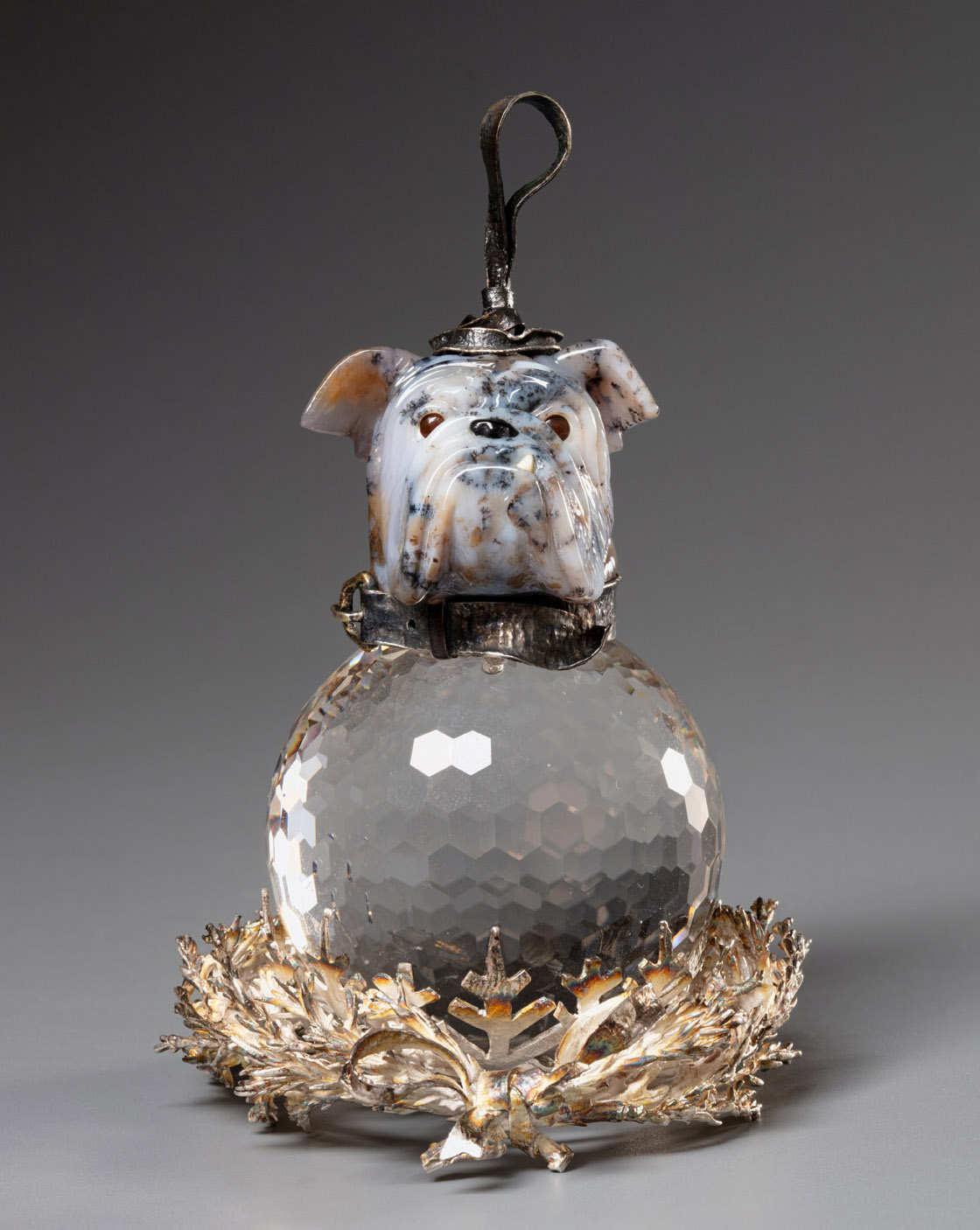 Елочная игрушка студии «Святогор» - шедевр камнерезного искусства, созданный в технике объемной мозаики. Выбранное авторами сочетание природных минералов может удивить даже самого искушенного зрителя: на легкий шар из горного хрусталя помещена голова английского бульдога, выполненная из кремня. Подобная компоновка органично сочетает в себе природную суровость камня и художественную элегантность стекла. Покрывающие поверхность шара 6-угольные фасеты создают эффект живого блеска, подчеркивая мягкость и объем фигуры. Серебряные детали игрушки - ошейник, шапочка и еловый венок - выделяют ювелирную тонкость работы, добавляя предмету изысканности и шарма.