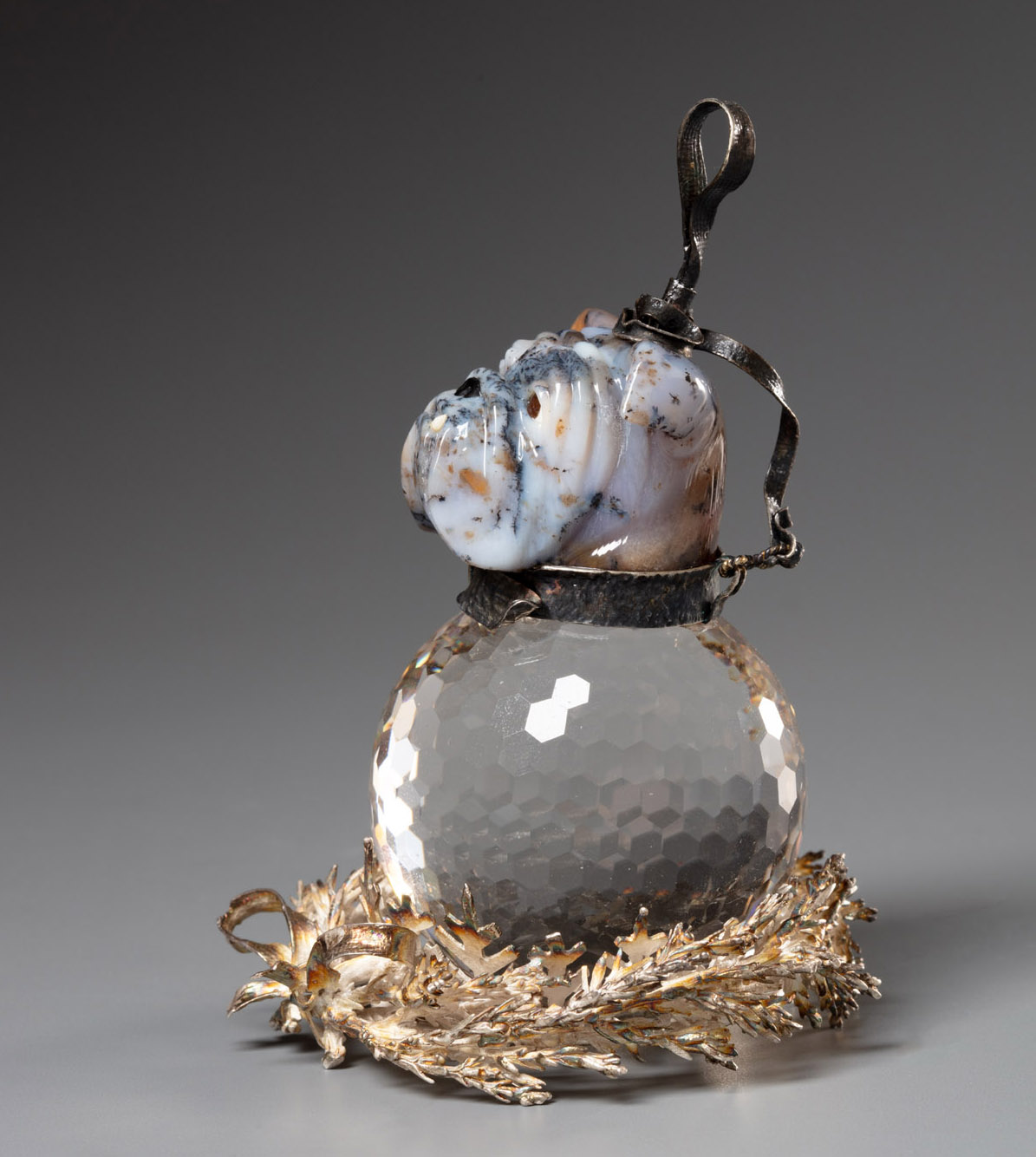 Агат, горный хрусталь, кремень, сердолик, эмаль, серебро; литьё, золочение, чернение, резьба, огранка, инкрустация, мозаика объёмная