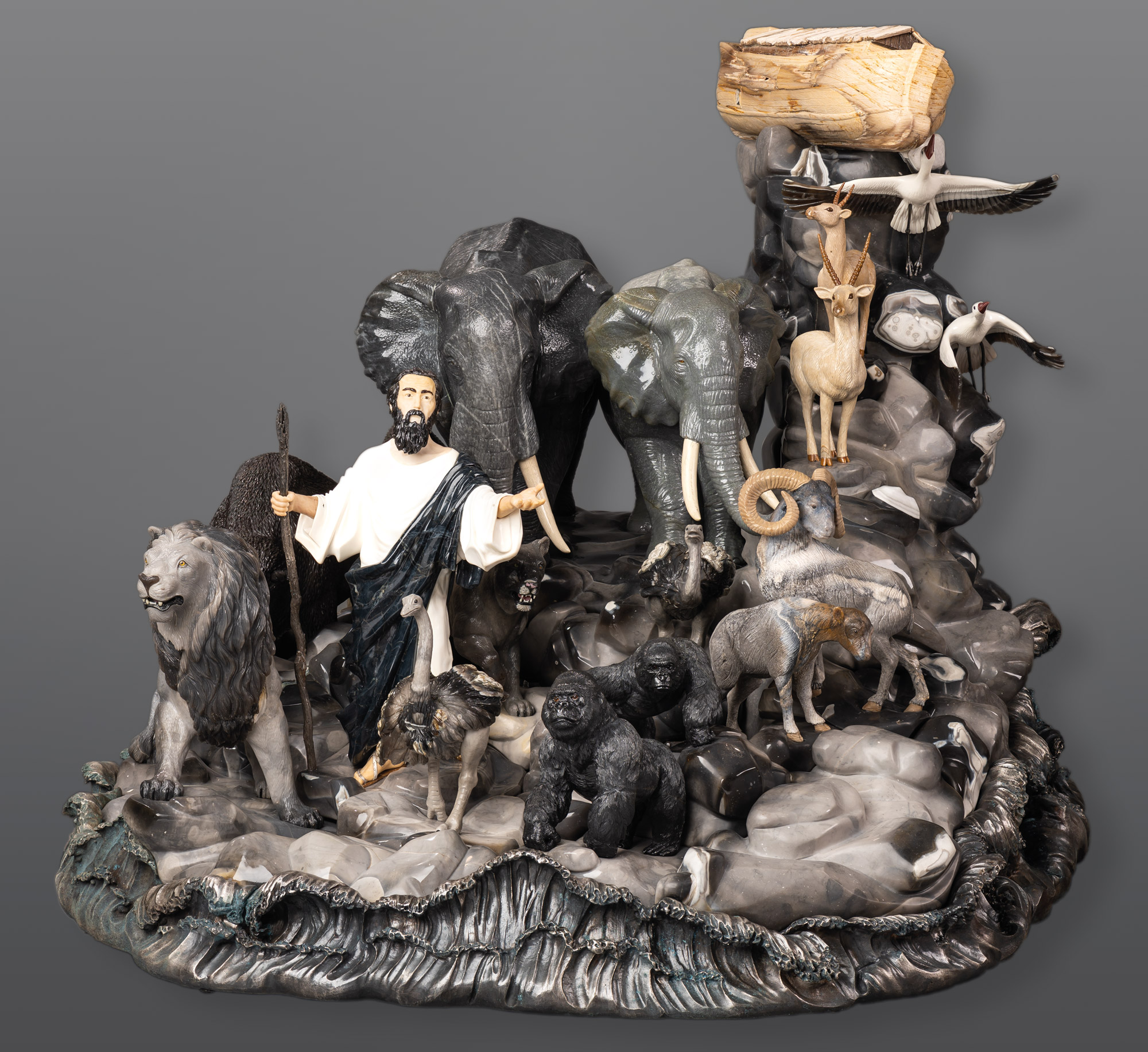 На округлой подставке с невысоким металлическим бортом в виде рельефных гребней волн размещена многофигурная ярусная композиция с завершением в форме деревянной модели ковчега.