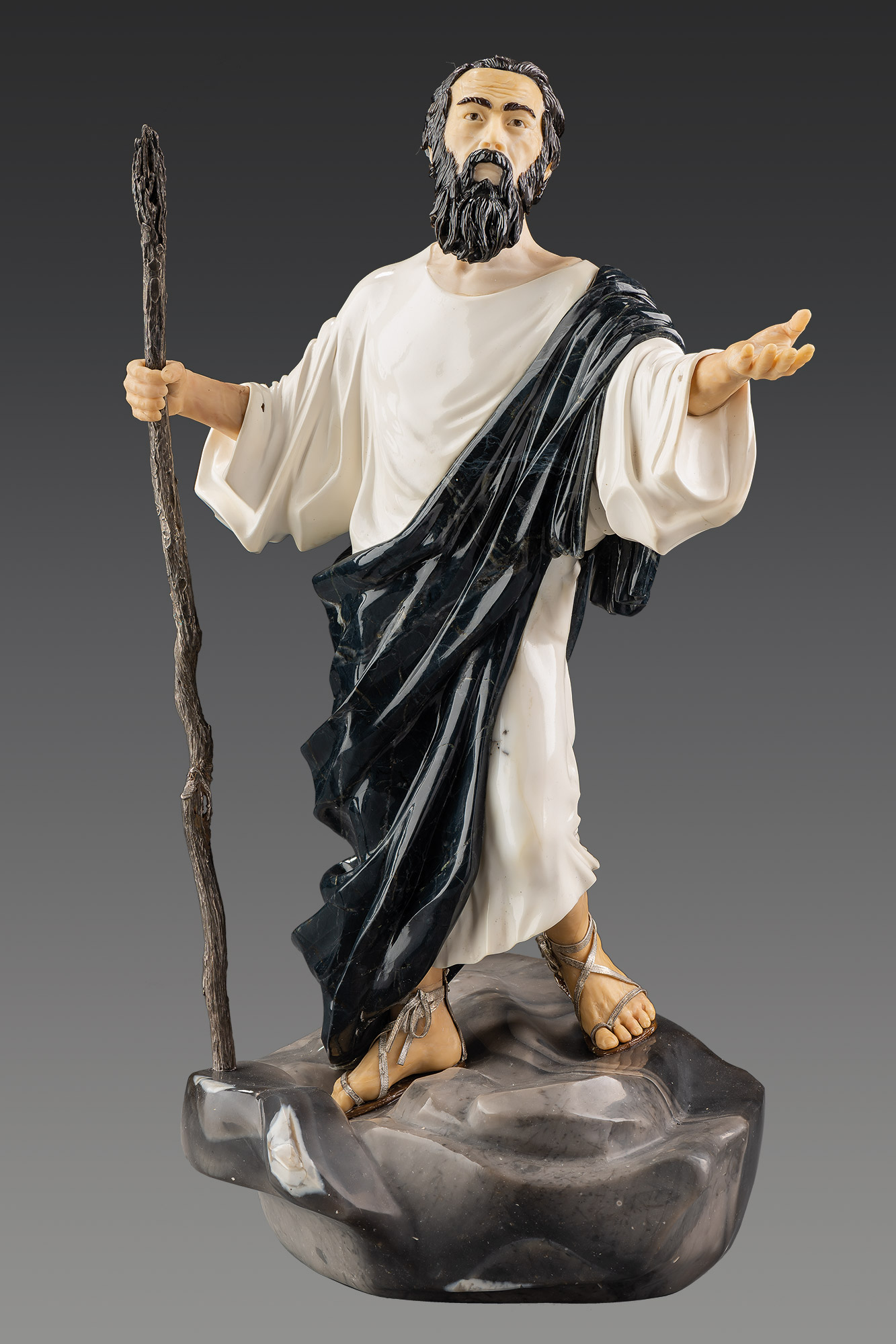 В центре — фигура стоящего на серой подставке черноволосого бородатого мужчины в длинной белой рубахе с перекинутым через левое плечо черным плащом и в плетеных сандалиях. В правой руке держит высокий посох, левая отставлена в сторону.