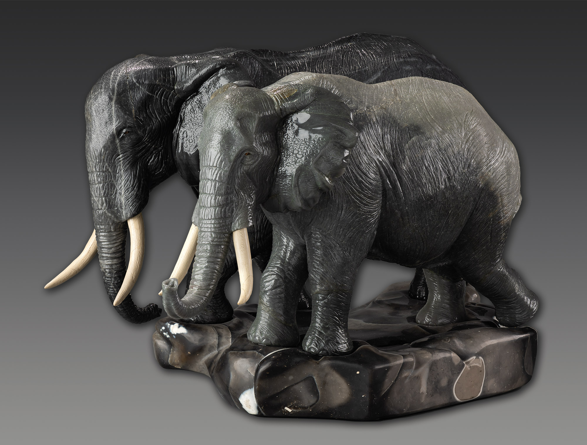 Неяркий, словно выгоревший под палящим солнцем колорит построен на взаимодействии черных, серых и разбеленных охристых и коричневых тонов с золотистыми росчерками рогов и бивней.