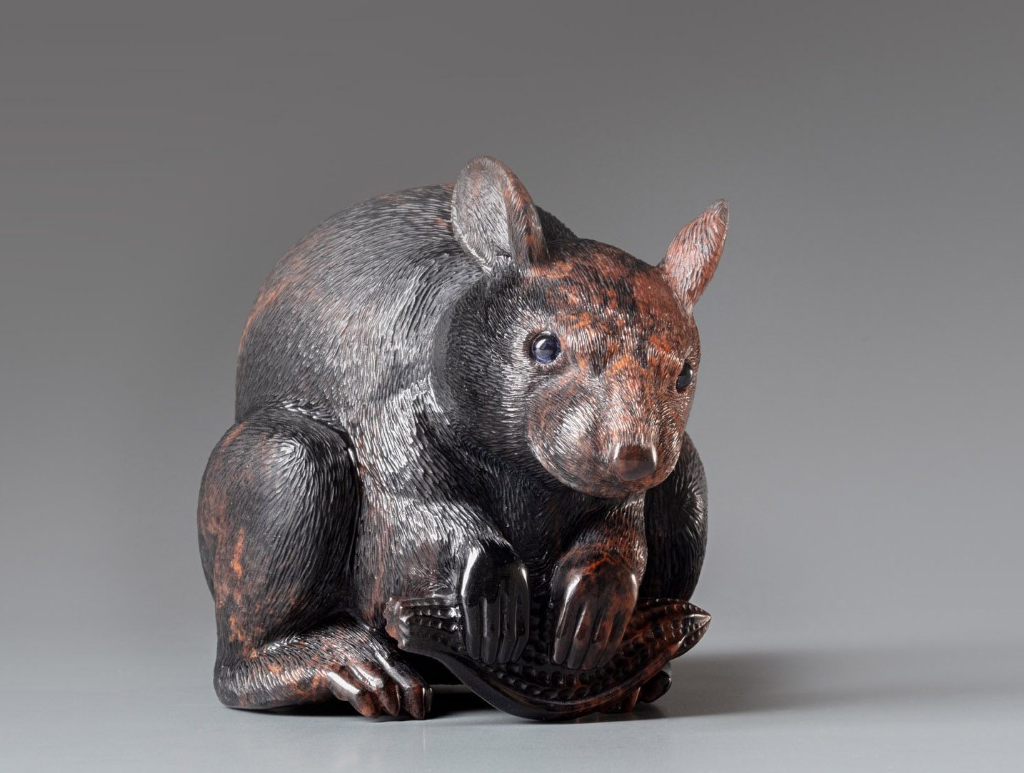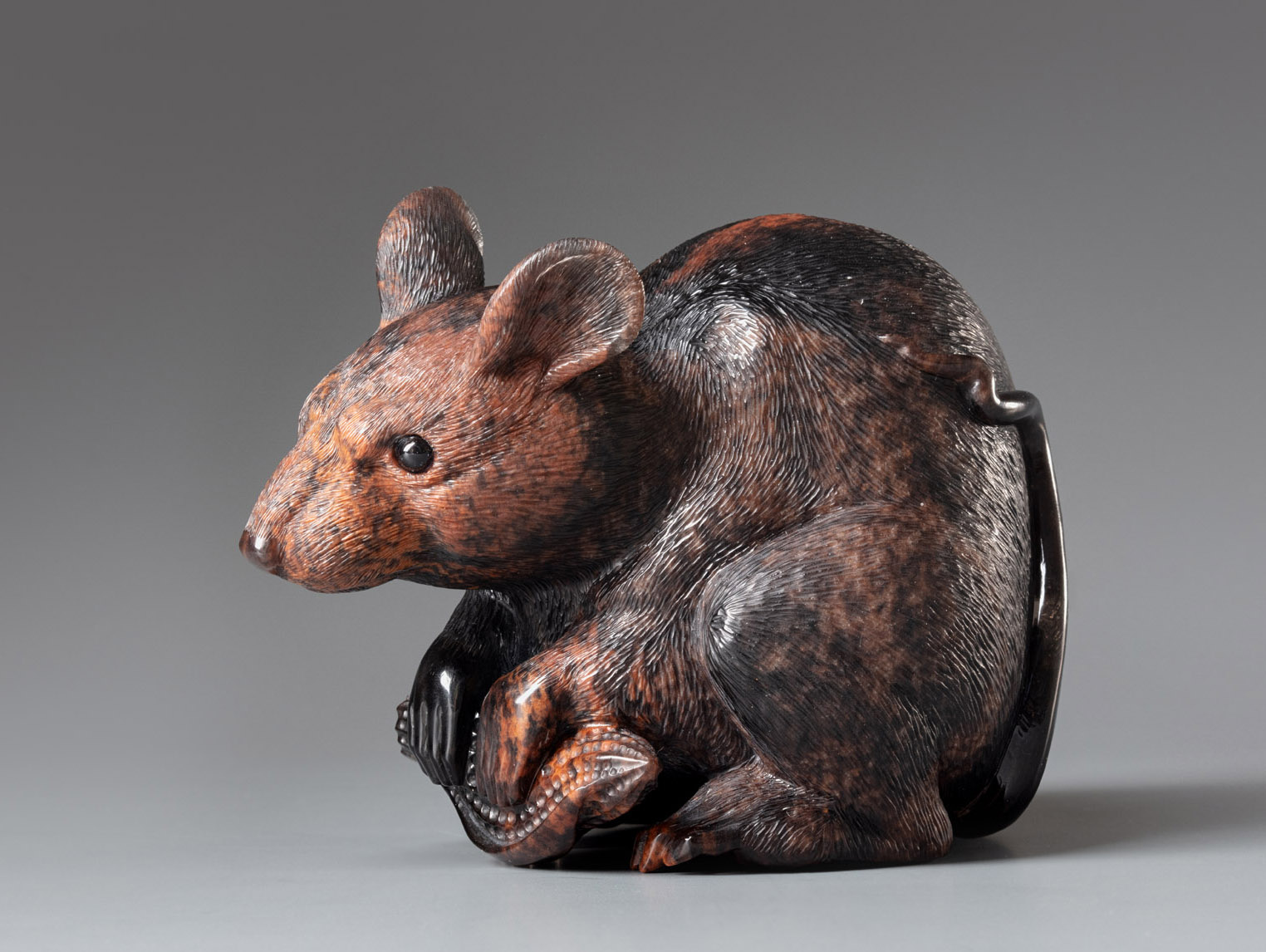 Насыщенные оттенки обсидиана варьируются от глубокого черного до коричневато-красных тонов, создавая ощущение теплого осеннего света. Крыса держит в лапках маленький плод, что дополняет ее связь с образом осени, когда природа дарит свои плоды, а животные готовятся к зиме. Эта работа - прекрасное сочетание символизма, высокого мастерства и лучших традиций в обработке камня, идеально подходящее для коллекционеров авторской малой пластики.